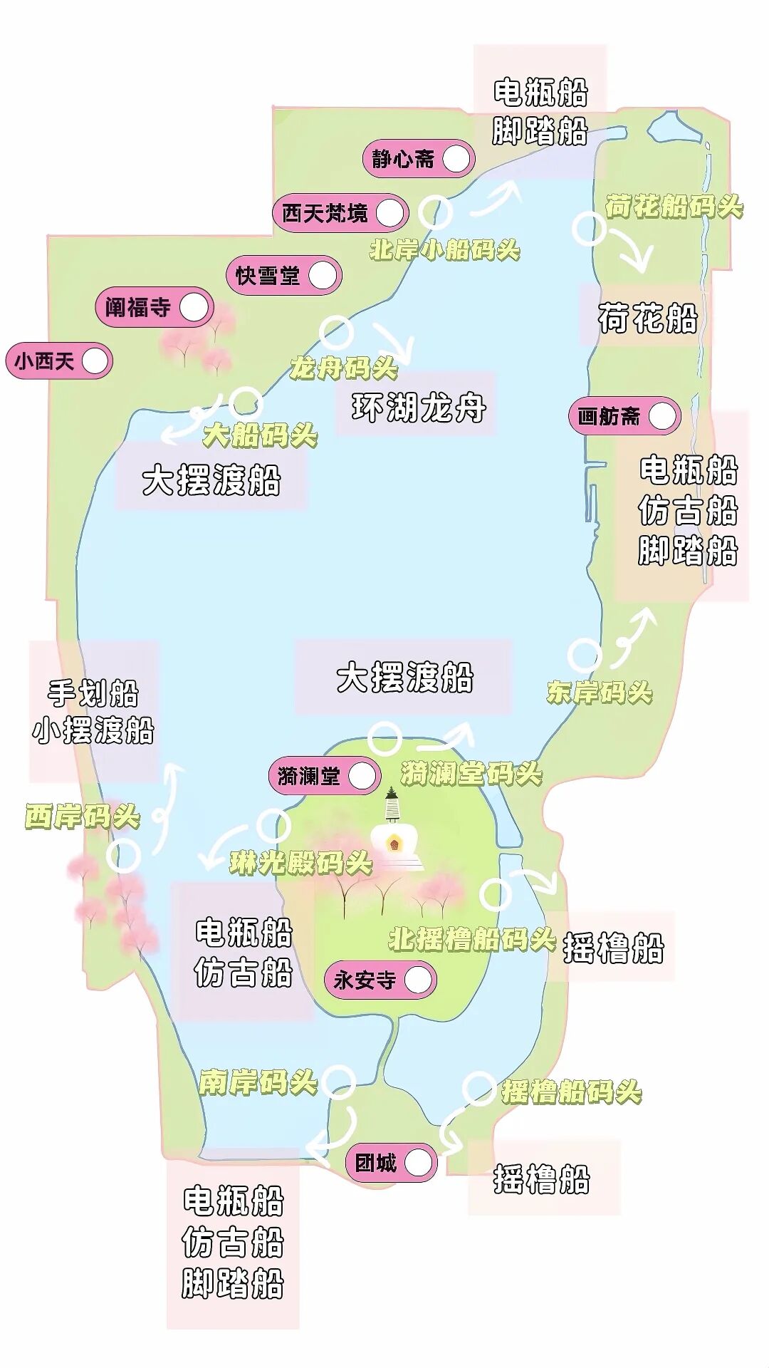 南岸、东岸、西岸、北岸和琼岛上均设有自驾船的码头。