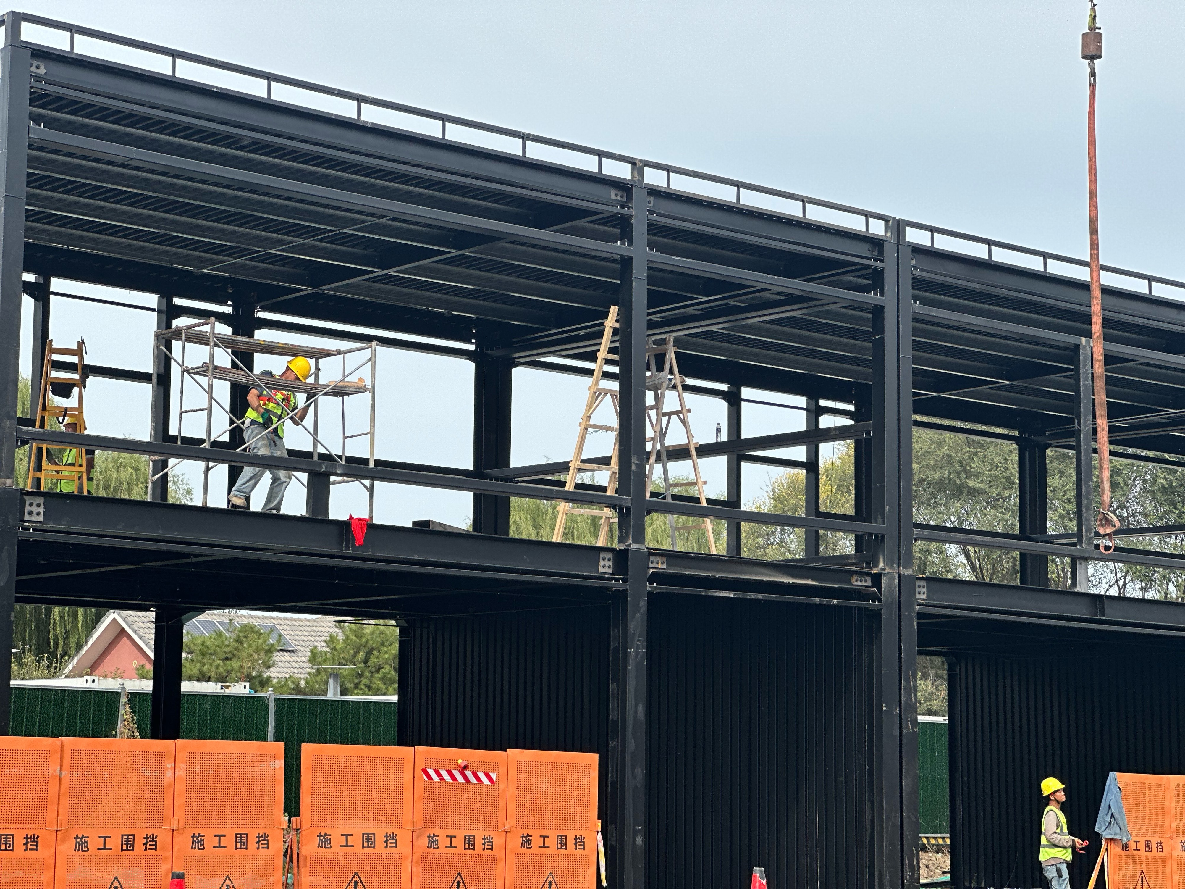 上午10点多,亦庄科创十七街上的车不多,往日走这条路的上班族已开启“度假模式”。但路两侧却格外忙碌,五辆吊车一字排开,数十米长的起重臂悬着钢结构零件,在施工人员的指挥下搭起黑色的建筑骨架。