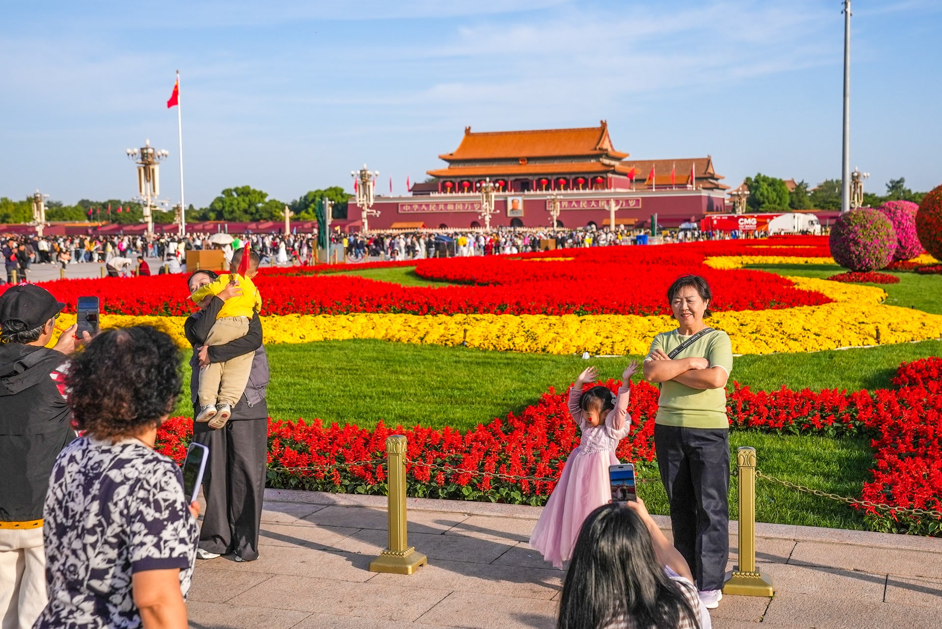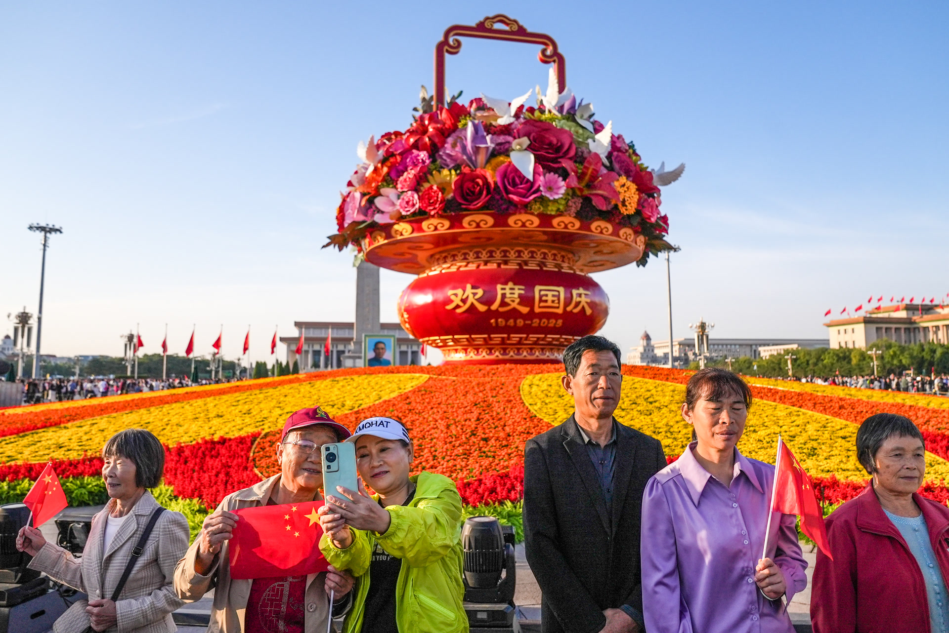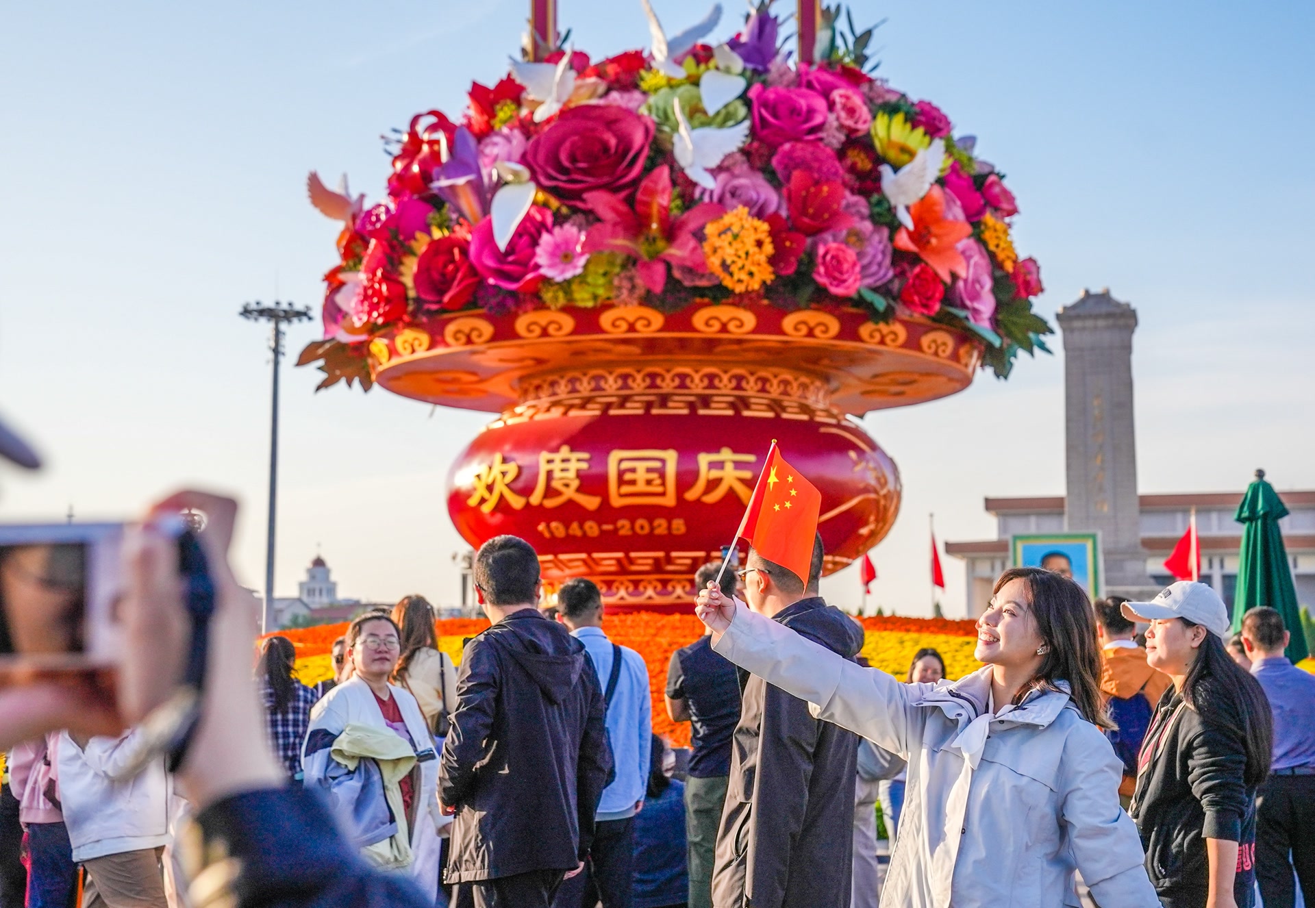 “麻烦帮个忙,帮我们和花篮合张影!”清晨的阳光刚洒上天安门广场,来自山东的李女士就举着小国旗,拉着家人站到“祝福祖国”巨型花篮前,与花篮合影留念。