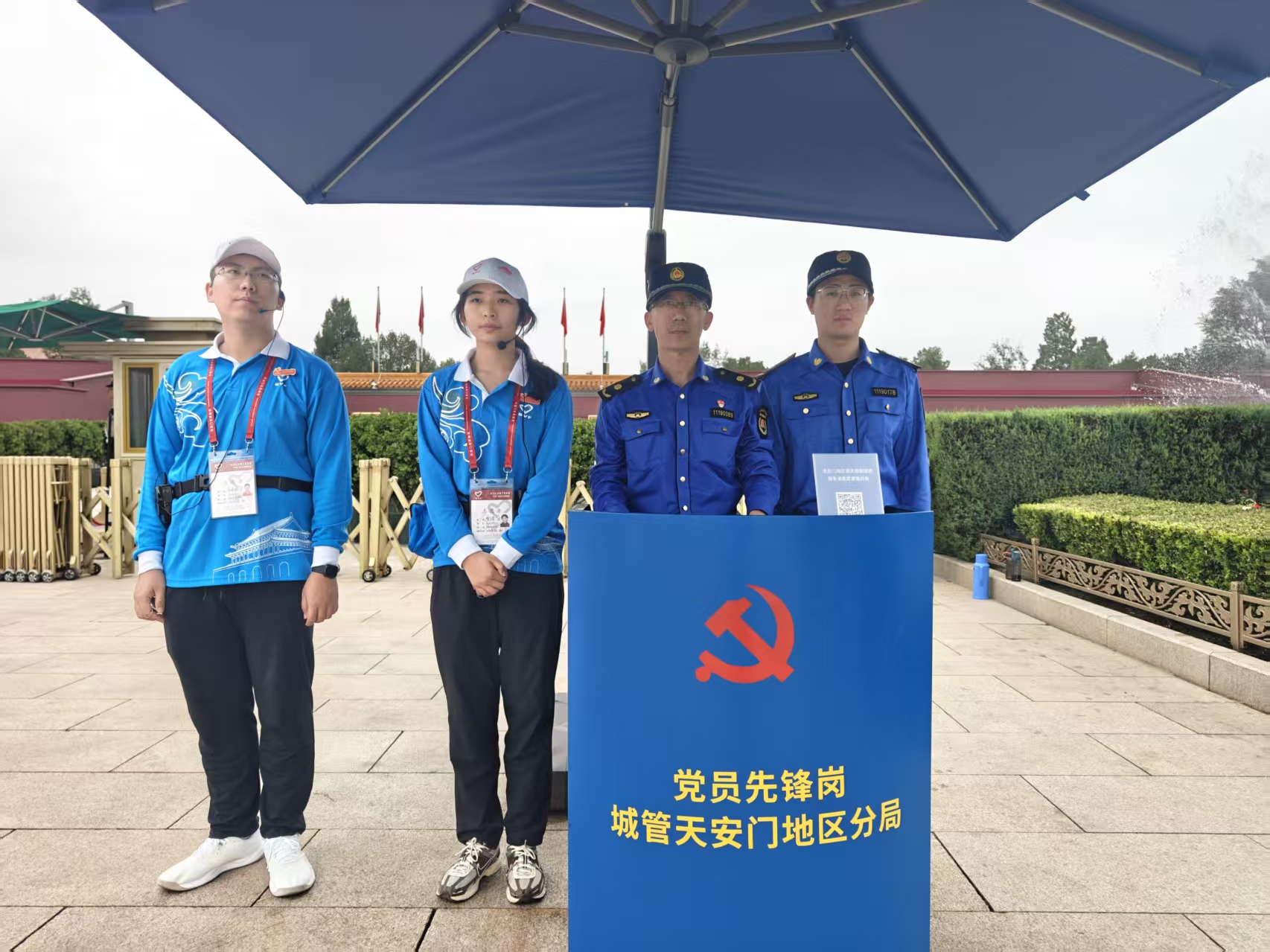 在金水桥畔,穿着深蓝色城管制服的黄淳毅正在帮游客指引厕所的位置。他所在的北京市城市管理综合行政执法局天安门地区分局于今年3月获得中宣部宣教局命名的第十批“岗位学雷锋集体标兵”称号,而他所值守的也是天安门地区管委会设立的党员先锋岗。“我们分局108个人,国庆期间24小时轮班。晚上清场、维持排队秩序,白天又要疏导客流,我10月1日早7点上岗,坚守24小时,一直到次日7点下班。虽然累,但看到大家安全游览,就觉得值。”黄淳毅的声音有些沙哑。