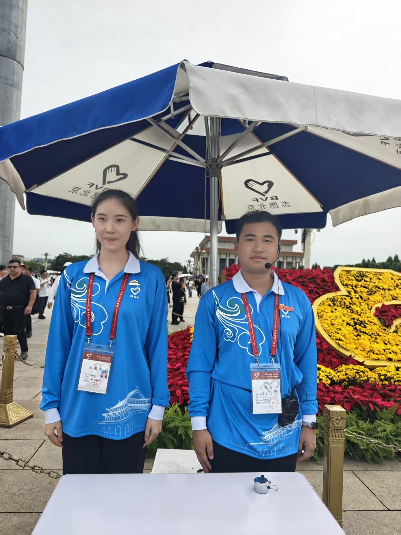 “这是我第9年在国庆期间值守,从大学生到央企职员,岗位没变,热情也没变。”姜晓轩擦了擦额头的汗,笑着说:“我们一个岗位两个人,8点半到9点半是第一班岗,之后每小时轮换一次,一天要站满三个班次。”