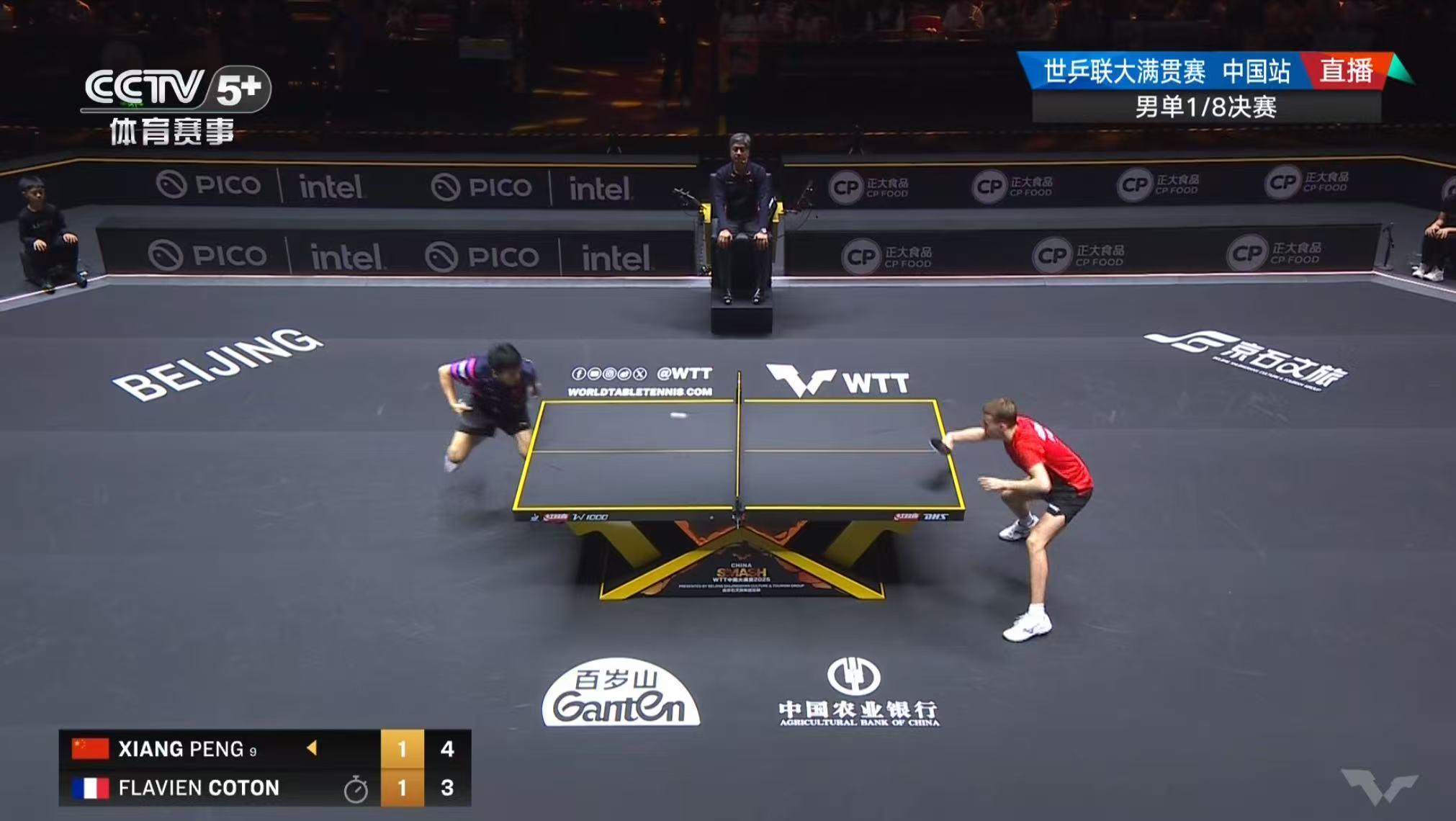 WTT中国大满贯男单1/8决赛,国乒选手向鹏3-1战胜法国选手科顿,晋级8强。四局比分:7-11、11-4、14-12、11-6。