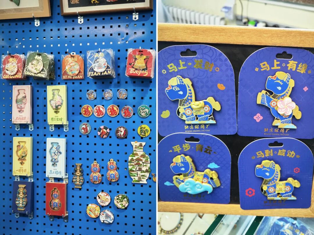 老物件承载记忆,新作品更显活力。位于珐琅厂一楼的京珐艺苑工厂店内,由中国工艺美术大师、国家级非遗传承人钟连盛先生设计监制,高级技师集体制作的景泰蓝赏盘《花锦映月》十分亮眼。北京工艺美术大师曾洁的景泰蓝新款《福禄寿喜财》吉庆葫芦小巧精致,承载了“招财纳福、财源滚滚”的美好祝愿。青年设计师聂宇麟的《马上献福》陶达瓶,以猴子、骏马、寿桃图案传递“马上有福”的祝愿,很受年轻游客青睐。10月2日至8日,活动还将组织以上各位工艺美术大师到现场进行轮番签售。