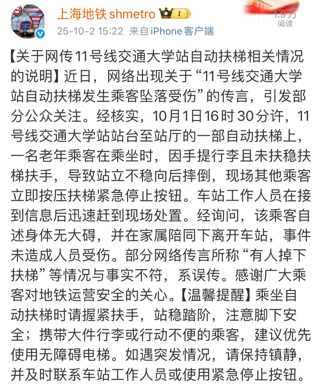 经核实,10月1日16时30分许,11号线交通大学站站台至站厅的一部自动扶梯上,一名老年乘客在乘坐时,因手提行李且未扶稳扶梯扶手,导致站立不稳向后摔倒,现场其他乘客立即按压扶梯紧急停止按钮。车站工作人员在接到信息后迅速赶到现场处置。