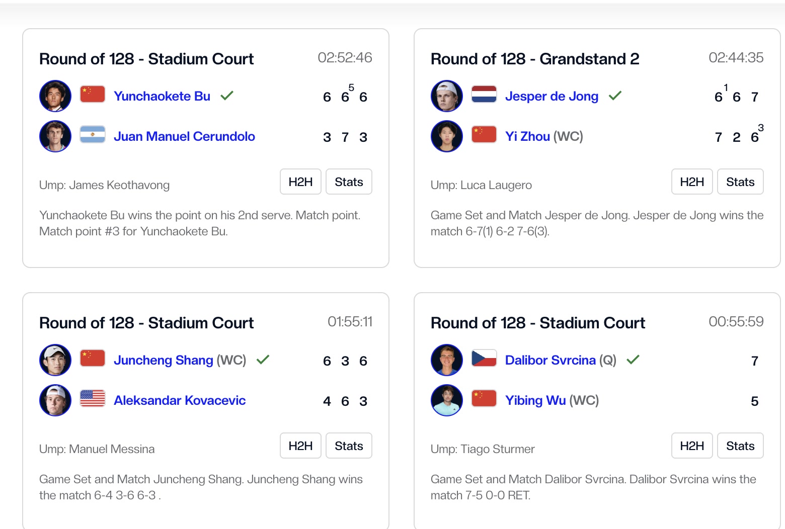 吴易昺在首盘盘末阶段不慎拉伤大腿肌肉,在5比7丢掉首盘后因伤退赛,他的对手斯夫尔奇纳晋级第二轮。