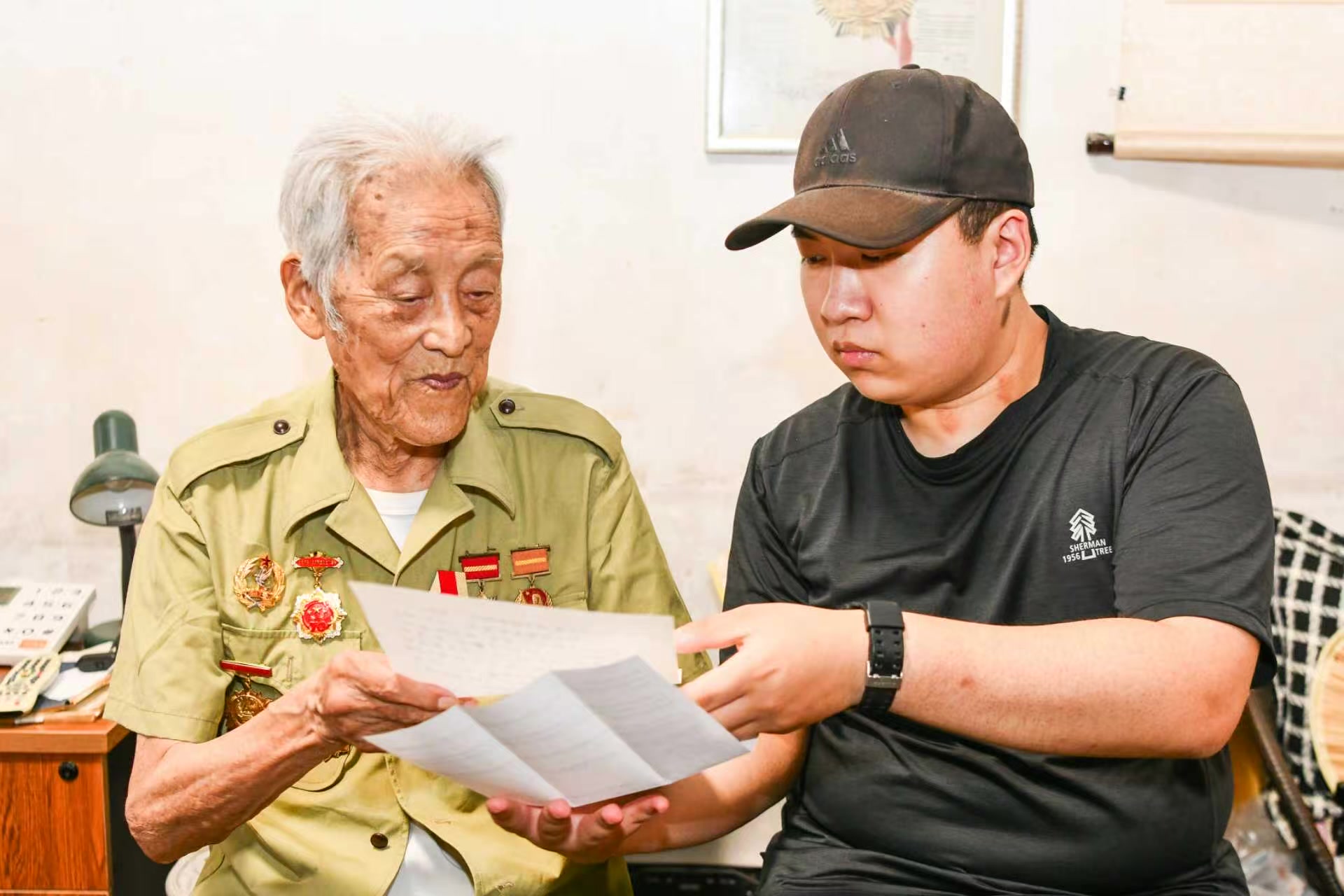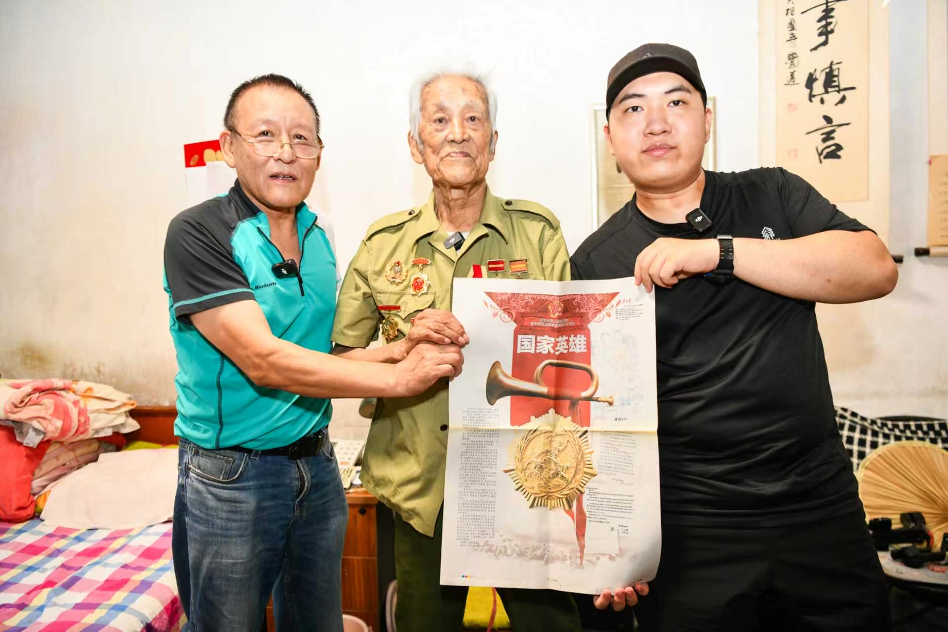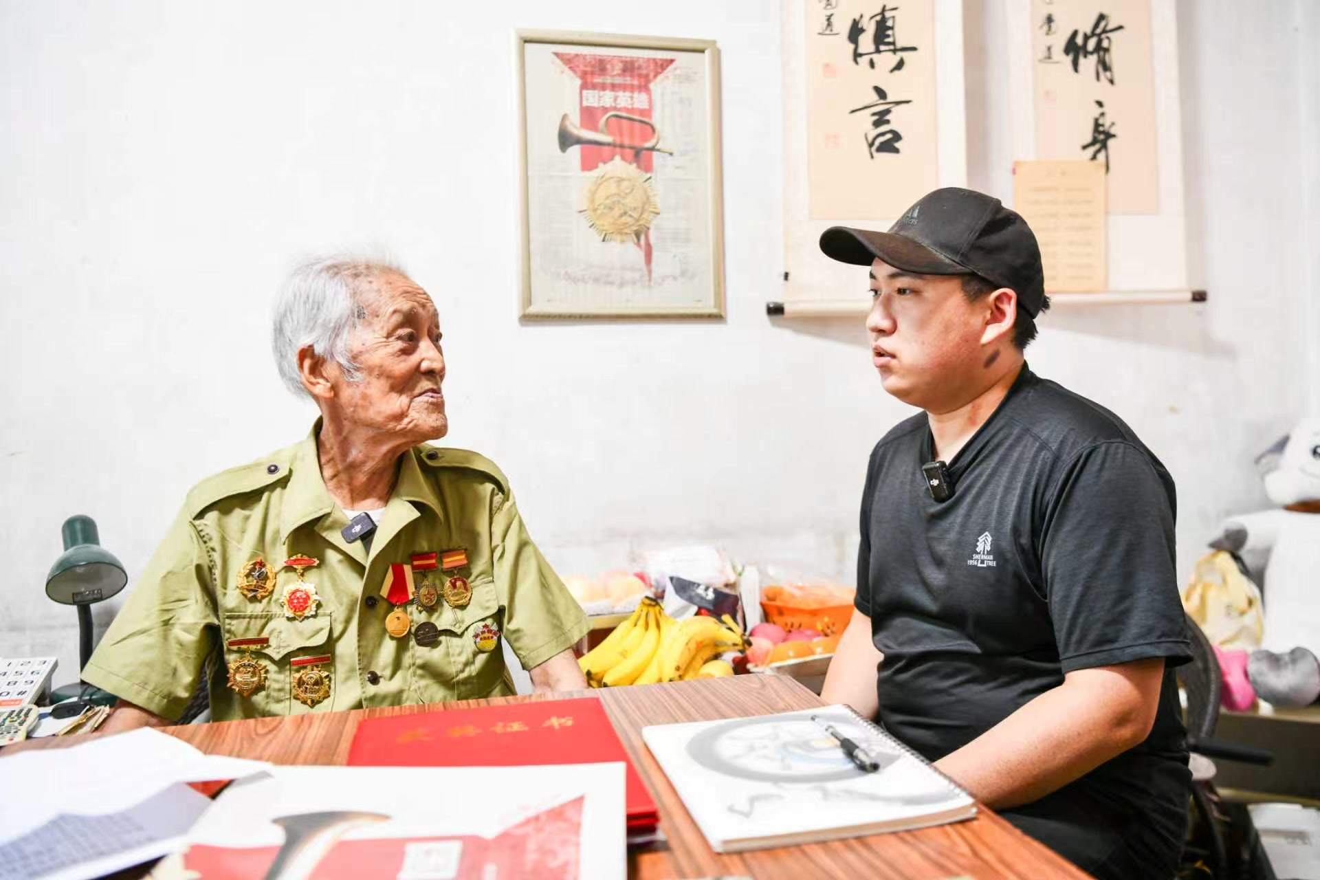 年轻人望着老人,满眼崇敬。从小,孙云歌就听姥姥讲家里祖辈参加抗战的故事。2015年,他11岁,生日当天,他做了个决定,和小伙伴们捐出压岁钱,发起“助养一位抗日老兵爷爷”公益项目。十年间,他帮扶了三位抗战老兵。