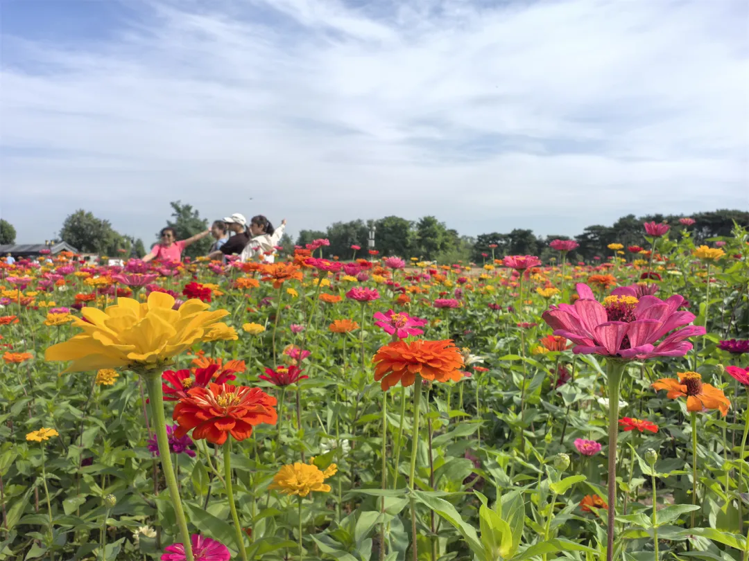 打破“来圆明园就逛大水法、西洋楼”的刻板印象,今年圆明园金秋游力推西部区域,这里就是“被低估的秋日秘境”——西部花海。从藻园门步入,向北而行,视线豁然开朗,上万平方米的土地上,月见草、百日菊、鼠尾草、波斯菊等十余种草本花卉蓬勃生长,交织成一片绚烂的海洋。其中,耐干旱、花期长的百日菊无疑是主角,其深红、明黄、亮紫、暖橘等浓烈色彩,共同构成了一幅巨大的自然调色盘,在秋日蓝天下展现出油画般的视觉冲击力。