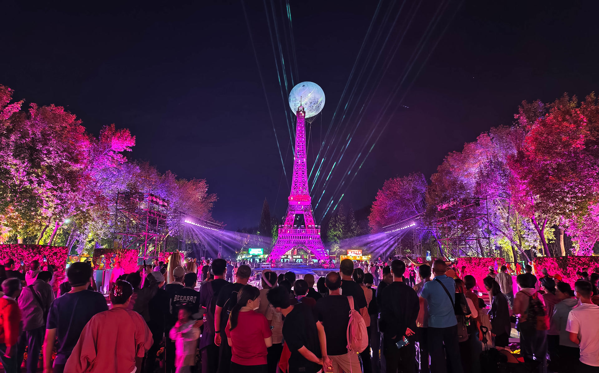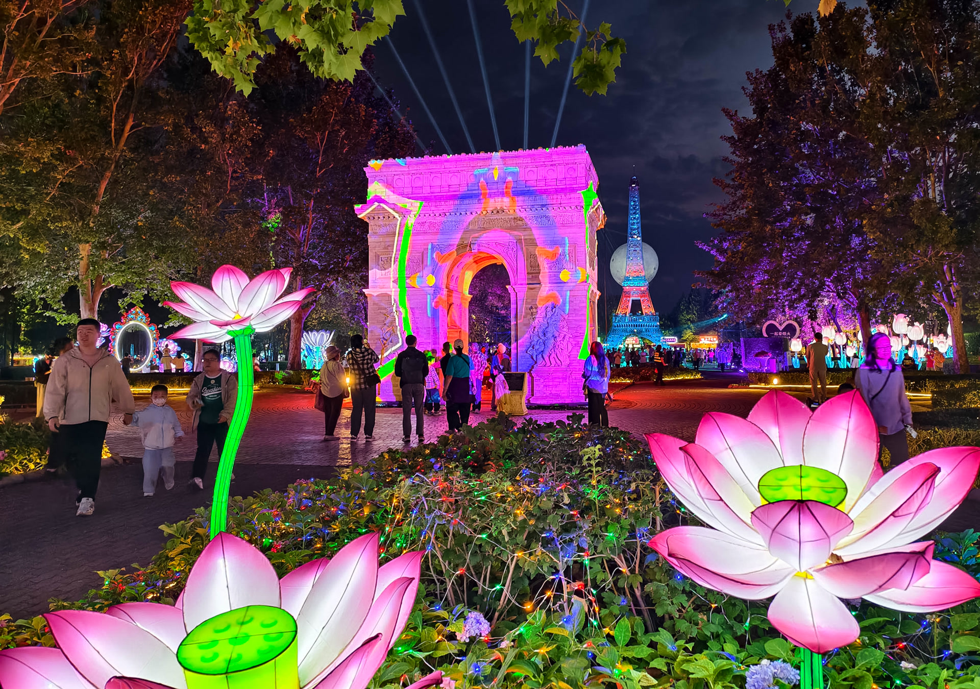 浪漫欧洲区聚集了最多的人气,“凯旋门”与“埃菲尔铁塔”在灯光映射下变换着色彩。抬头望去,天空上悬挂着一轮美轮美奂的“超级月亮”,与铁塔尖顶相映成趣,中秋佳节和西方地标在此碰撞出浪漫的火花。美洲区与非洲区的主干道设置了“诗词走廊”,悬挂着古今中外的咏月名篇,游客可在赏灯之余共赴文化之旅。