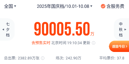 据网络平台数据,截至10月3日19时10分,2025年国庆档电影总票房(含预售)破9亿!