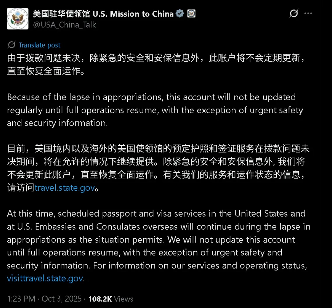 据环球时报报道,北京时间10月3日下午1时23分,美国驻华使领馆在美国社交平台X上的官方账号上宣布,由于拨款问题未解决,除紧急的安全和安保信息外,此账户将不会定期更新,直至恢复全面运作。