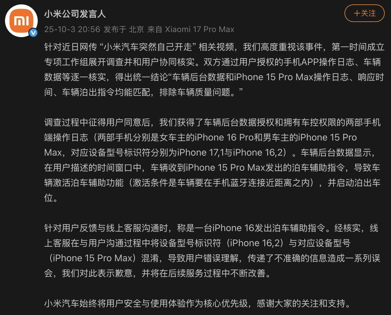 针对近日网传 “小米汽车突然自己开走” 相关视频,我们高度重视该事件,第一时间成立专项工作组展开调查并和用户协同核实。双方通过用户授权的手机APP操作日志、车辆数据等逐一核实,得出统一结论“车辆后台数据和iPhone 15 Pro Max操作日志、响应时间、车辆泊出指令均能匹配,排除车辆质量问题。”