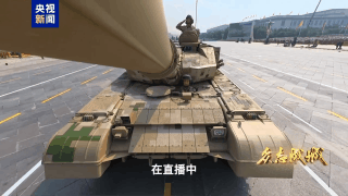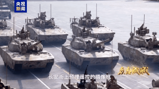 长安街上预埋遥控的摄像机和仰拍镜头让战车如钢铁洪流迎面而来,势不可挡。