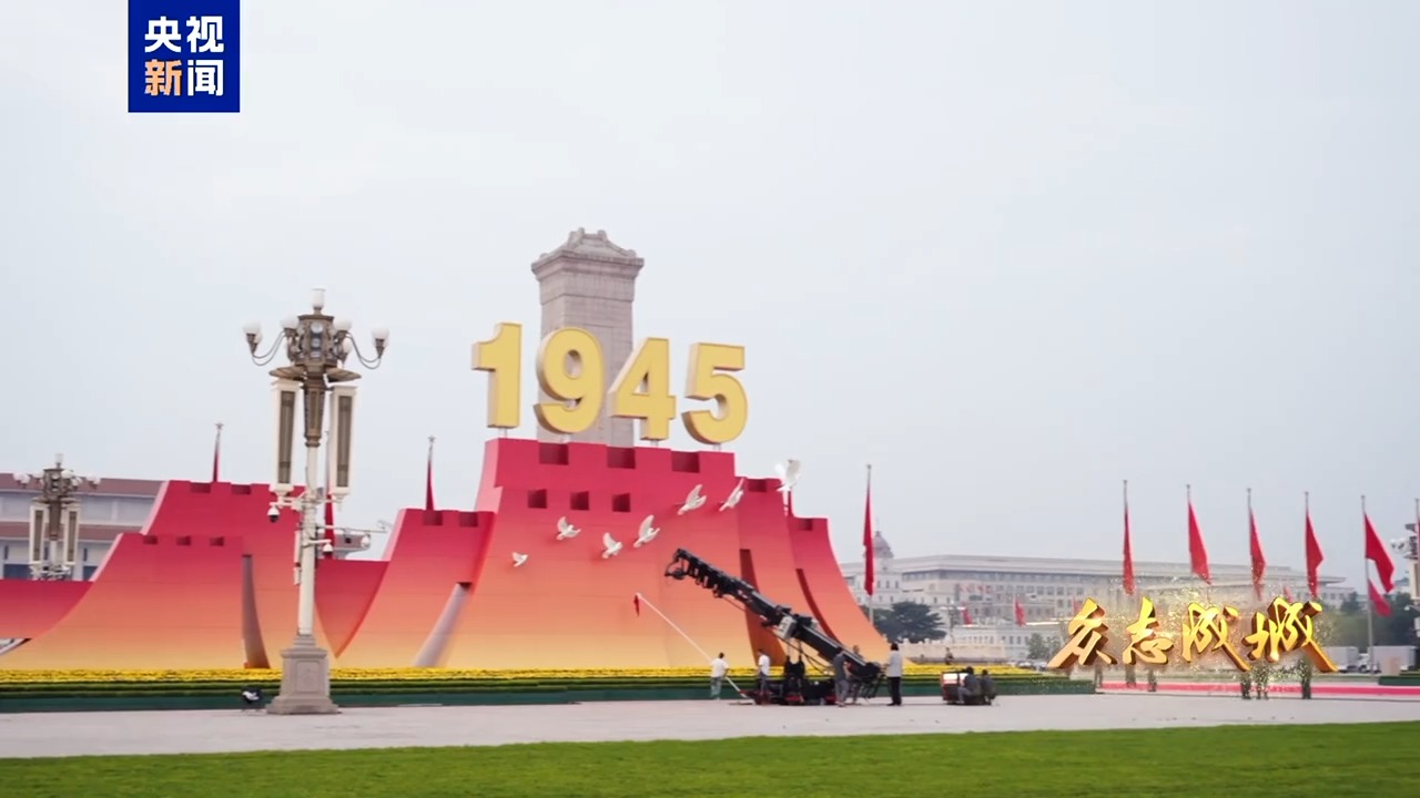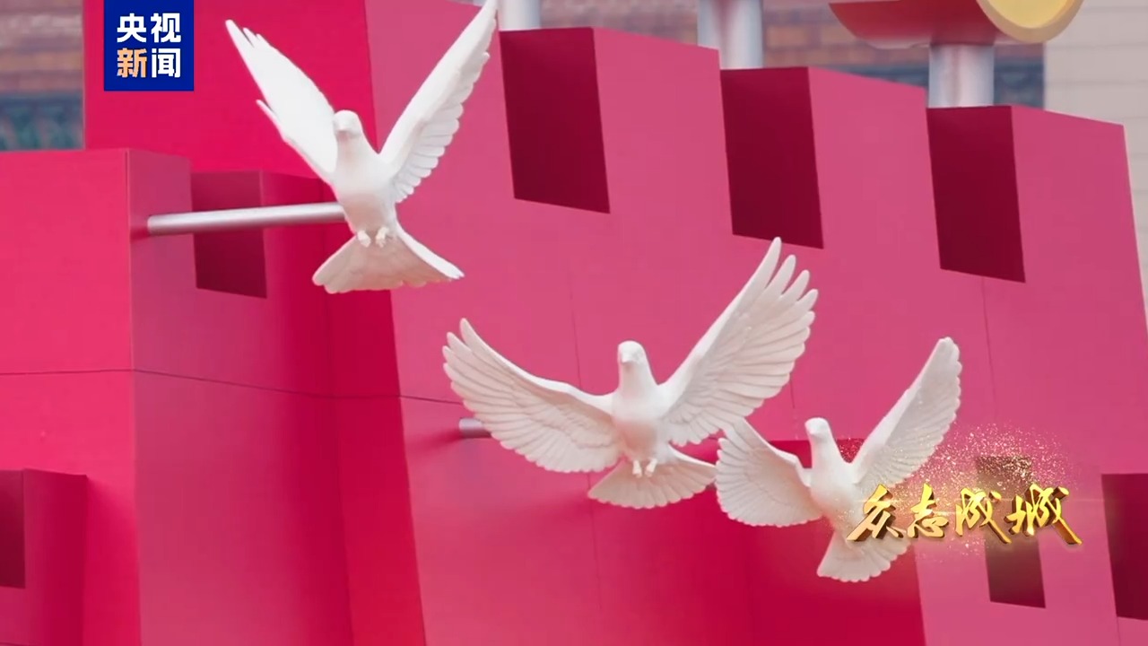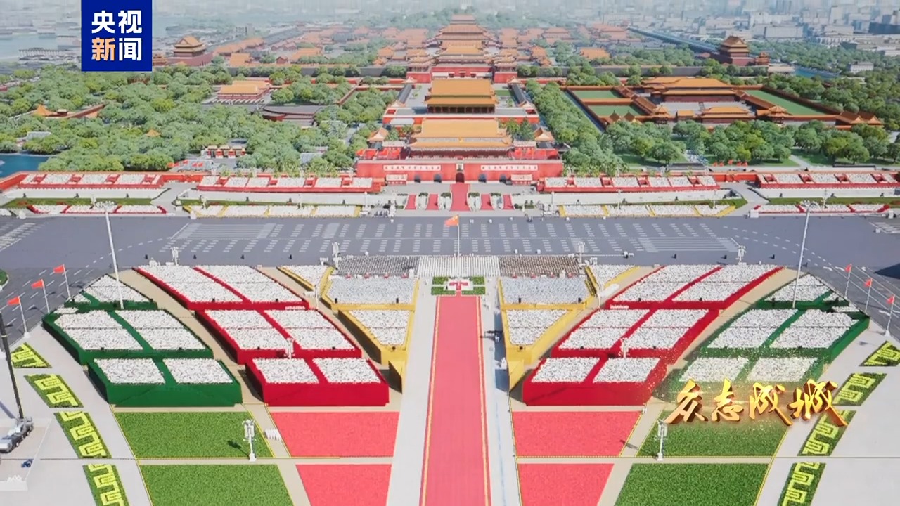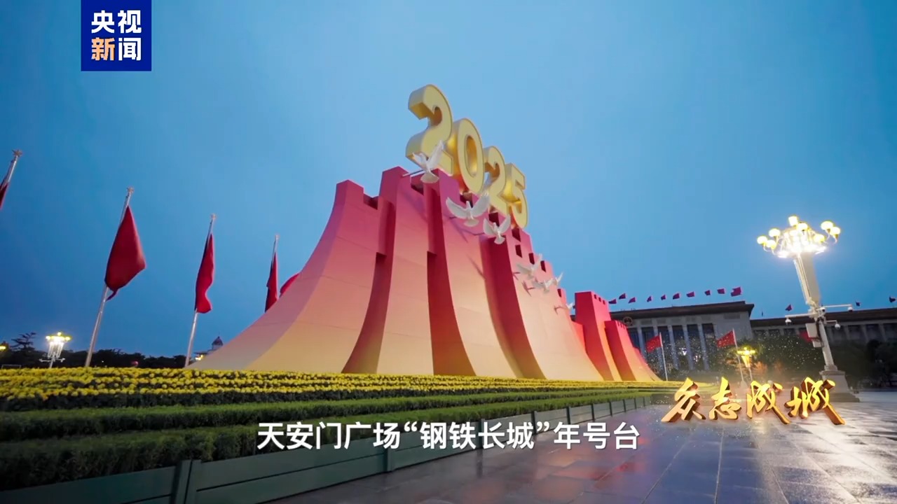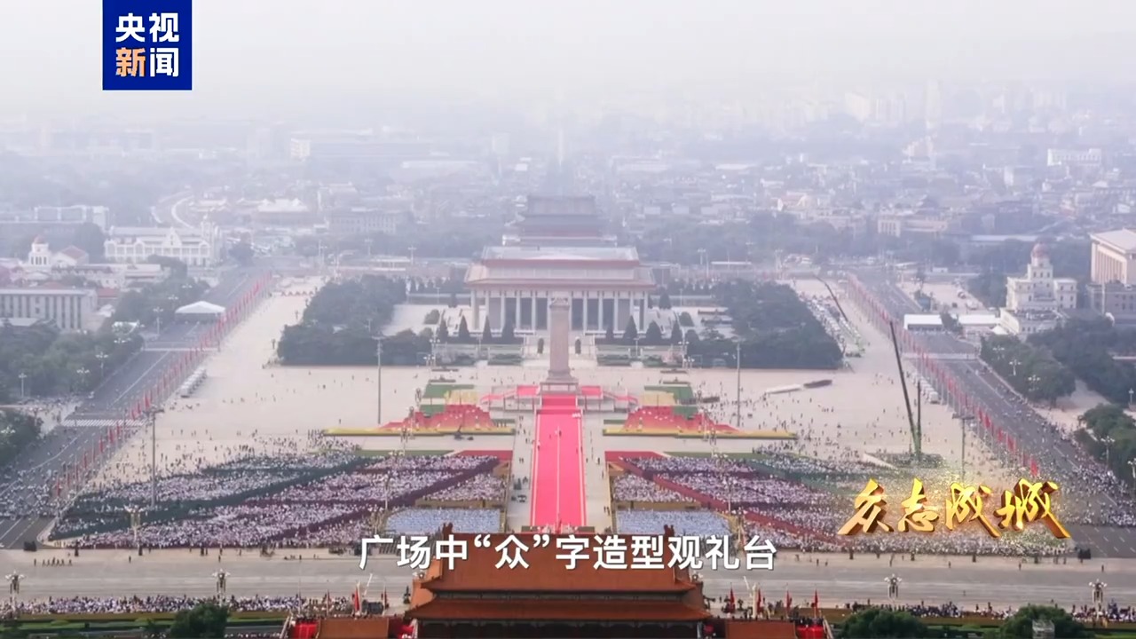 9月3日,首都北京,旌旗飘扬。天安门城楼庄严雄伟,天安门广场气象恢宏。人民英雄纪念碑前,“钢铁长城”主题景观巍然矗立,14座烽燧托举起“1945”“2025”字样,14只“和平鸽”振翅飞翔,寓意着十四载浴血奋战战、八十年精神传承。从空中俯瞰,广场中“众”字造型观礼台蔚为壮观,象征着在中国共产党领导下中国人民万众一心、众志成城,向着中华民族伟大复兴昂扬奋进。
