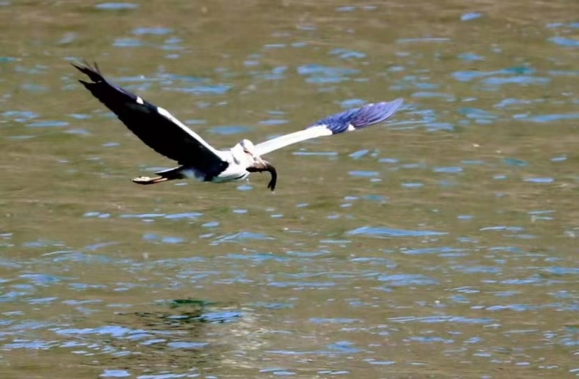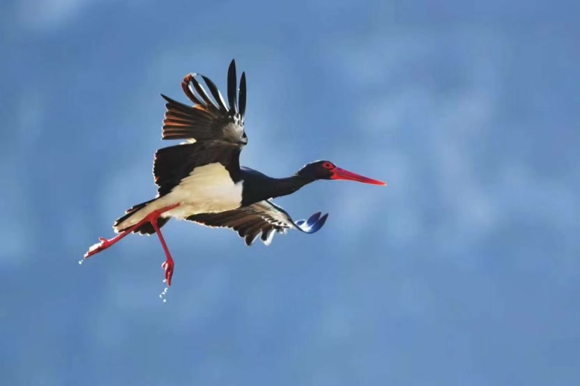 经过补水与生态修复,永定河水质达到地表水III类标准,再现了“碧水长流”的壮观景象。不只黑鹳,珍稀鸟类真不少:流域内大宁调蓄水库内,东方白鹳展翅飞舞,它们缺少鸣管不会鸣叫,只能通过拍打坚硬的上下嘴,发出“嗒嗒嗒”的嘴响声以传递交流的信号;