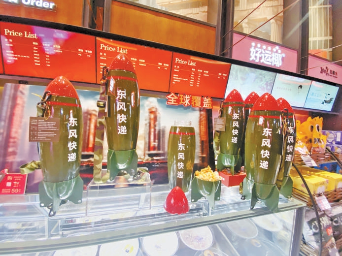 记者在现场看到,万达影城推出了一款“东风快递”爆米花桶联名周边产品,采用马口铁材质,还原导弹造型,兼具实用性和纪念意义,观众凭影票可享专属福利价59.9元。现场一个小男孩在拿到这个爆米花桶后爱不释手地玩了起来,他的父亲张先生告诉记者,这次看的是陈凯歌执导的电影《志愿军:浴血和平》,“这个爆米花桶非常贴合这部影片的主题,也让孩子从小能接受爱国主义教育。”