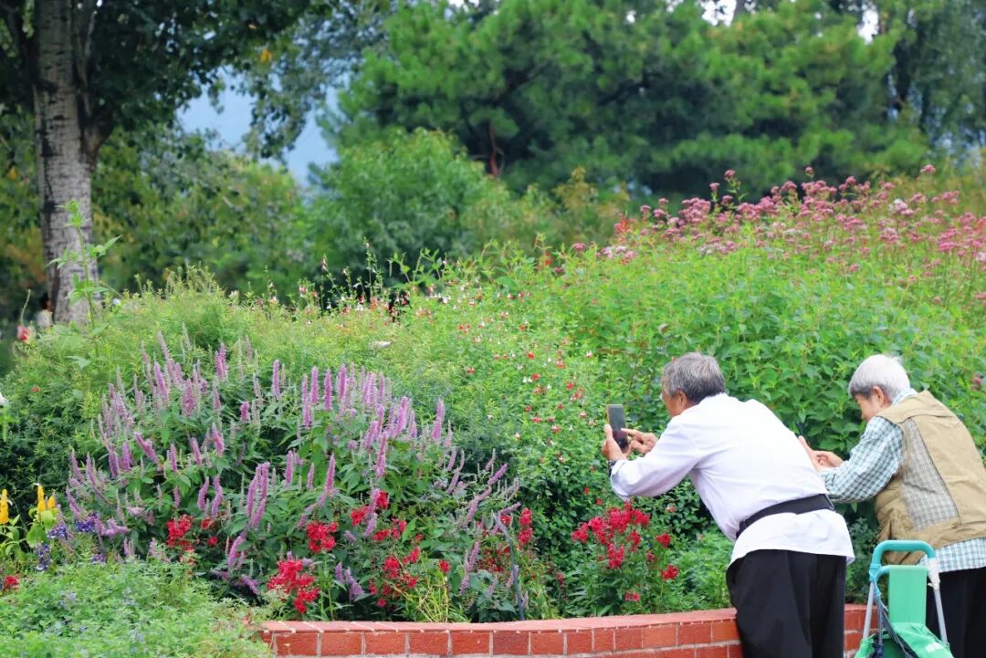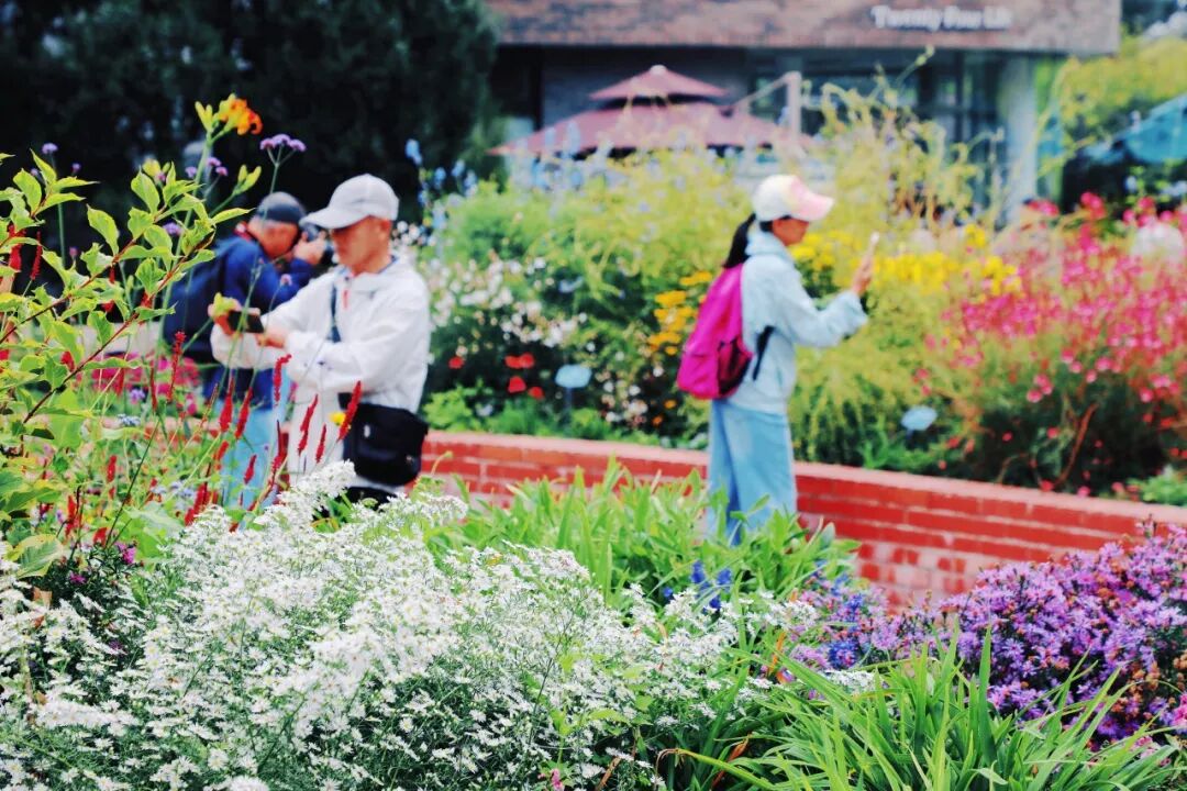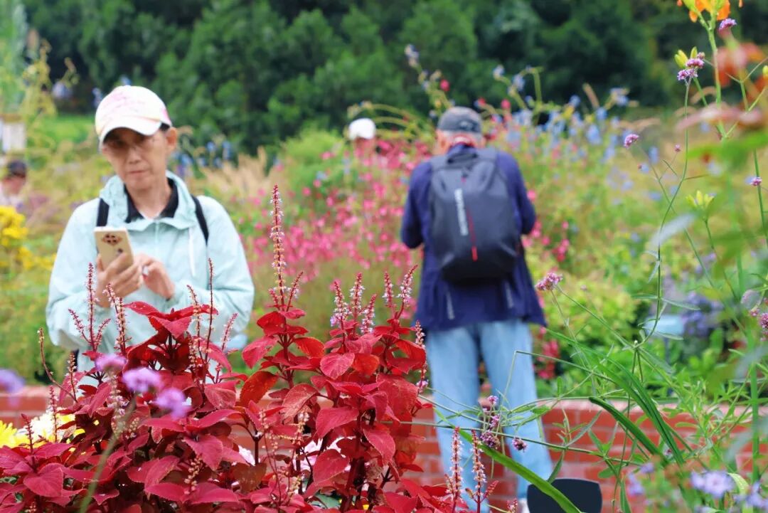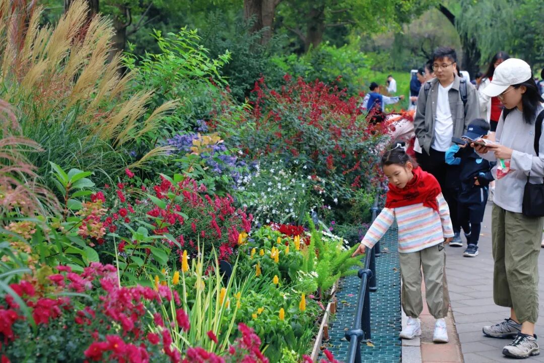 花境中不同色系的秋花秋草,千姿百态层层叠叠,似是绚丽织锦缓缓铺开,吸引着人们的目光。