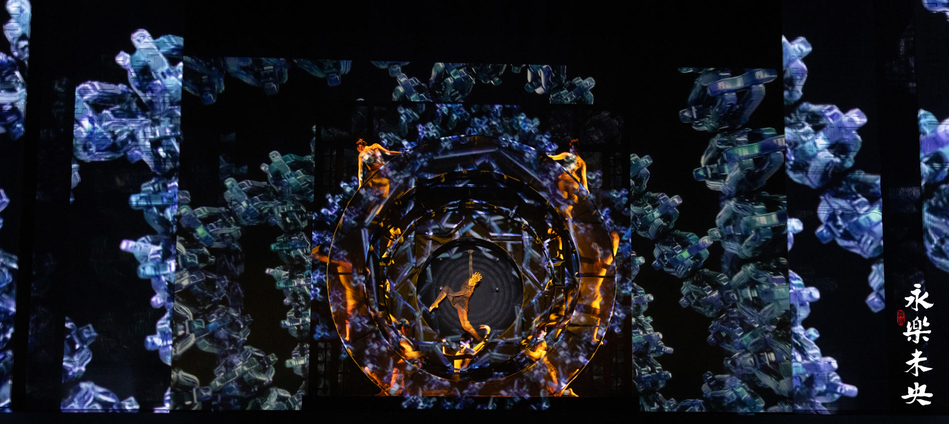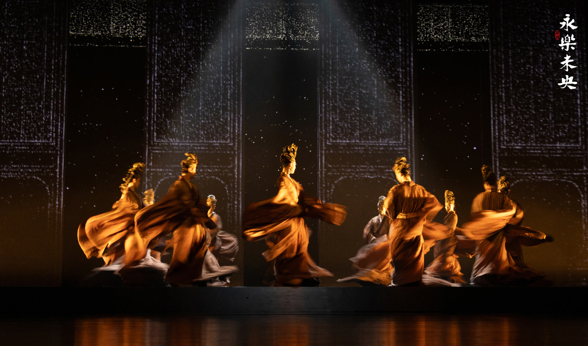 《永乐未央》的美学风格汲取永乐宫壁画艺术之灵韵,将中国画“以线为骨、以线状物传神”的美学理念转化为舞蹈语汇,让文物不仅活起来,而且舞起来。日月轮转,九重飞檐起伏;斗拱层叠,应着舞姿生长,舞者们配合默契的动作,流畅舒展的身段,行云流水的表演,再现了古建榫卯结构的精巧大气和壁画笔墨神韵的灵动飘逸。