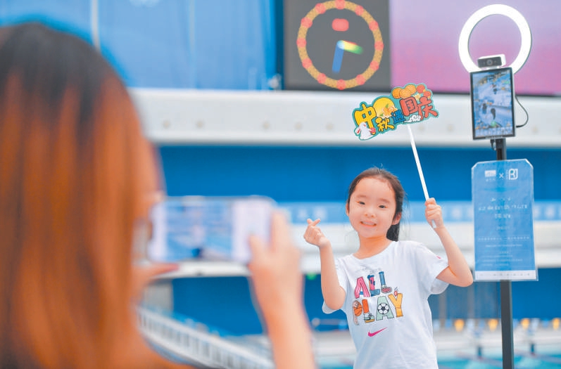 小朋友与国家游泳中心“水立方”合影留念。 潘之望摄