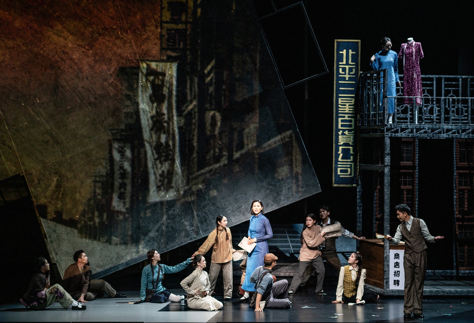 值得一提的是,该剧的舞美设计也极具现代感。舞台以“人生十字路口的选择”为创意核心,着重突出空间纵深感,将建筑形象以“倒映”“镜像”“悬浮”等造型方式运用于舞台之上,重现当年那个颠倒黑白的世界和破碎的家国。舞台上,多时空的交错、多空间的平行蒙太奇也时常出现,作为戏剧语言完成对角色的打造和剧情的陈述。多媒体设计则将舞台局部放大,营造视觉美感,通过色彩夸张强化人物内心。