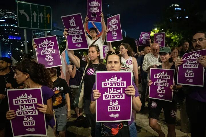 8月17日晚,人们在以色列中部城市特拉维夫的以色列国防部大楼附近参加游行示威活动,敦促以政府尽快与哈马斯达成停火协议,让所有被扣押人员获释。新华社记者陈君清摄