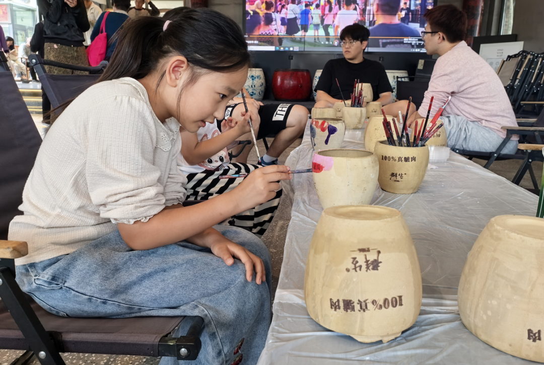 群生大院里小朋友在画瓦罐。饭后,不少游客继续到咖啡厅小坐,看书拍照,享受惬意的午后时光;孩子们则到儿童乐园里与小动物亲密接触,收获满满快乐。