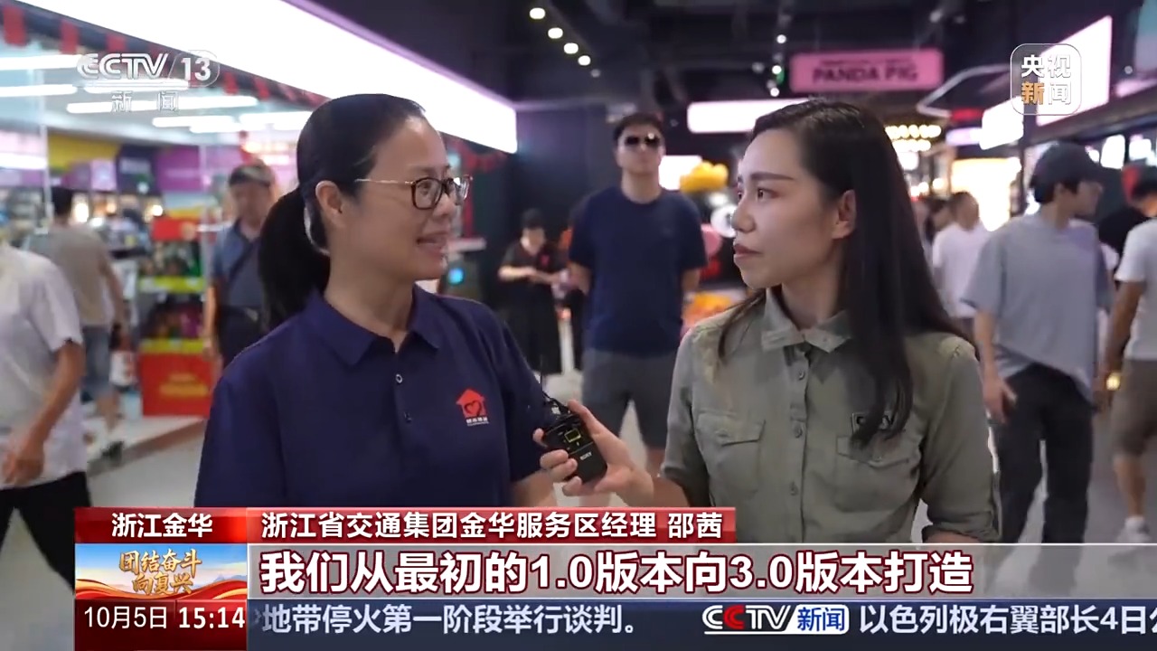 浙江省交通集团金华服务区经理 邵茜:作为高速公路的窗口单位,我们从最初的1.0版本向3.0版本打造。真正实现了从“过路经济”向“停留经济”转型,通过一些金华两头乌的地方美食,客人从服务区平均停留时长从15分钟延长到了40分钟,真正实现了流量规模与经济效益双丰收。