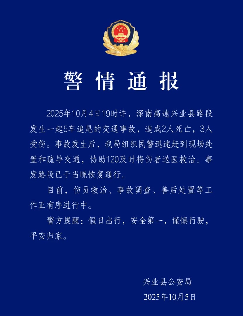 10月4日19时许,深南高速兴业县路段发生一起5车追尾的交通事故,造成2人死亡,3人受伤。