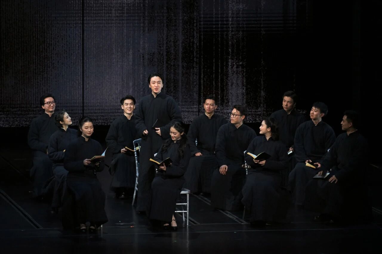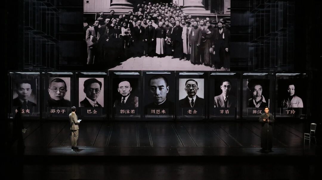 剧中,萧红、萧军等东北作家为抗战奋笔疾书,老舍在日军炮火声中弹落书本的灰尘,郭沫若于国难之时返回祖国,丁玲奔赴延安,巴金在寒夜中创作《寒夜》,聂耳探求中国音乐出路谱写出《义勇军进行曲》,冼星海怀揣爱国之志写就《黄河大合唱》……当演员以“歌队”形式肃立于舞台,齐声诵读抗战时期文艺家的宣言时,庄严的仪式感瞬间笼罩全场。多媒体屏上投射出先辈形象,与演员的表演层层交织。