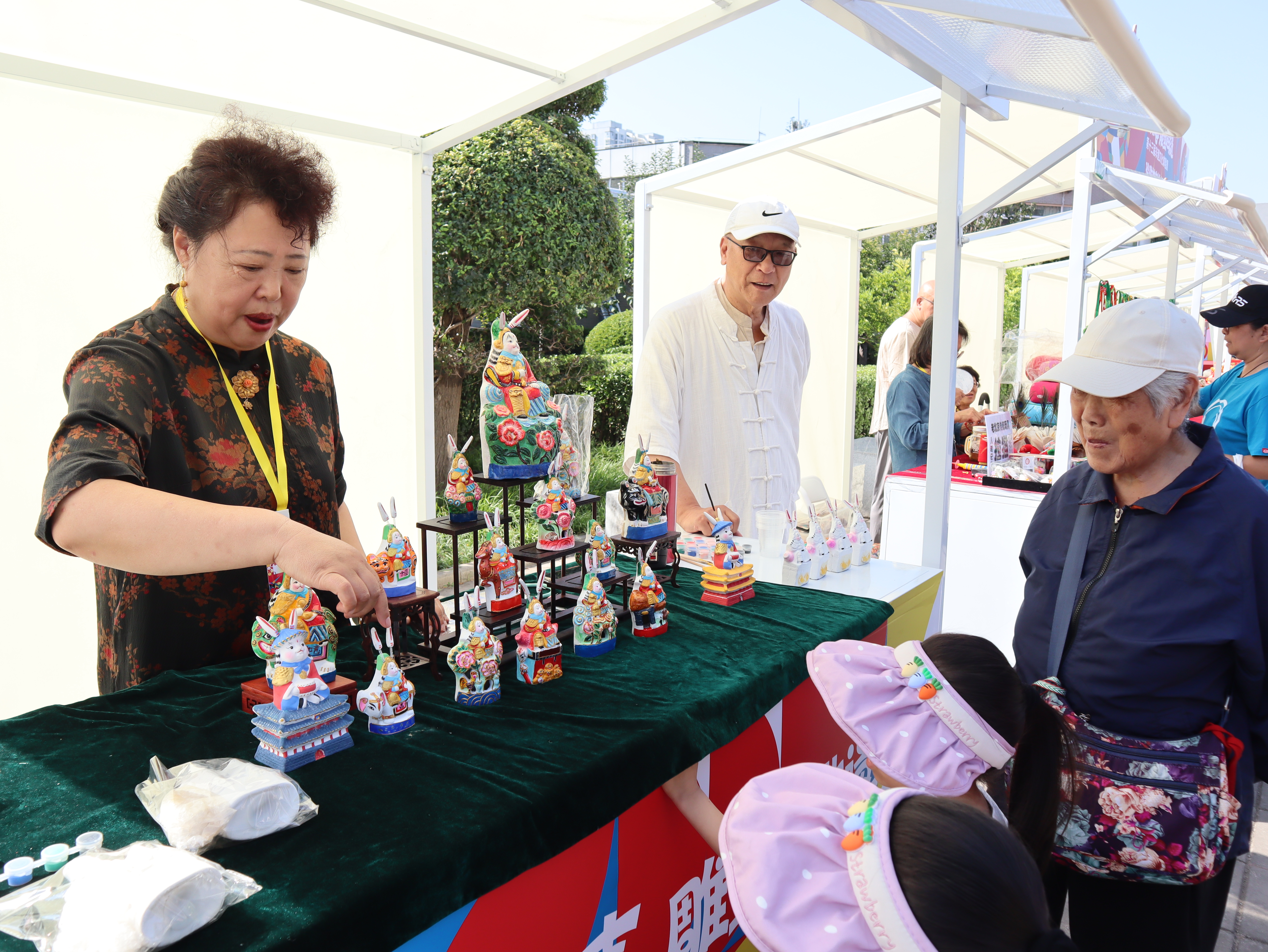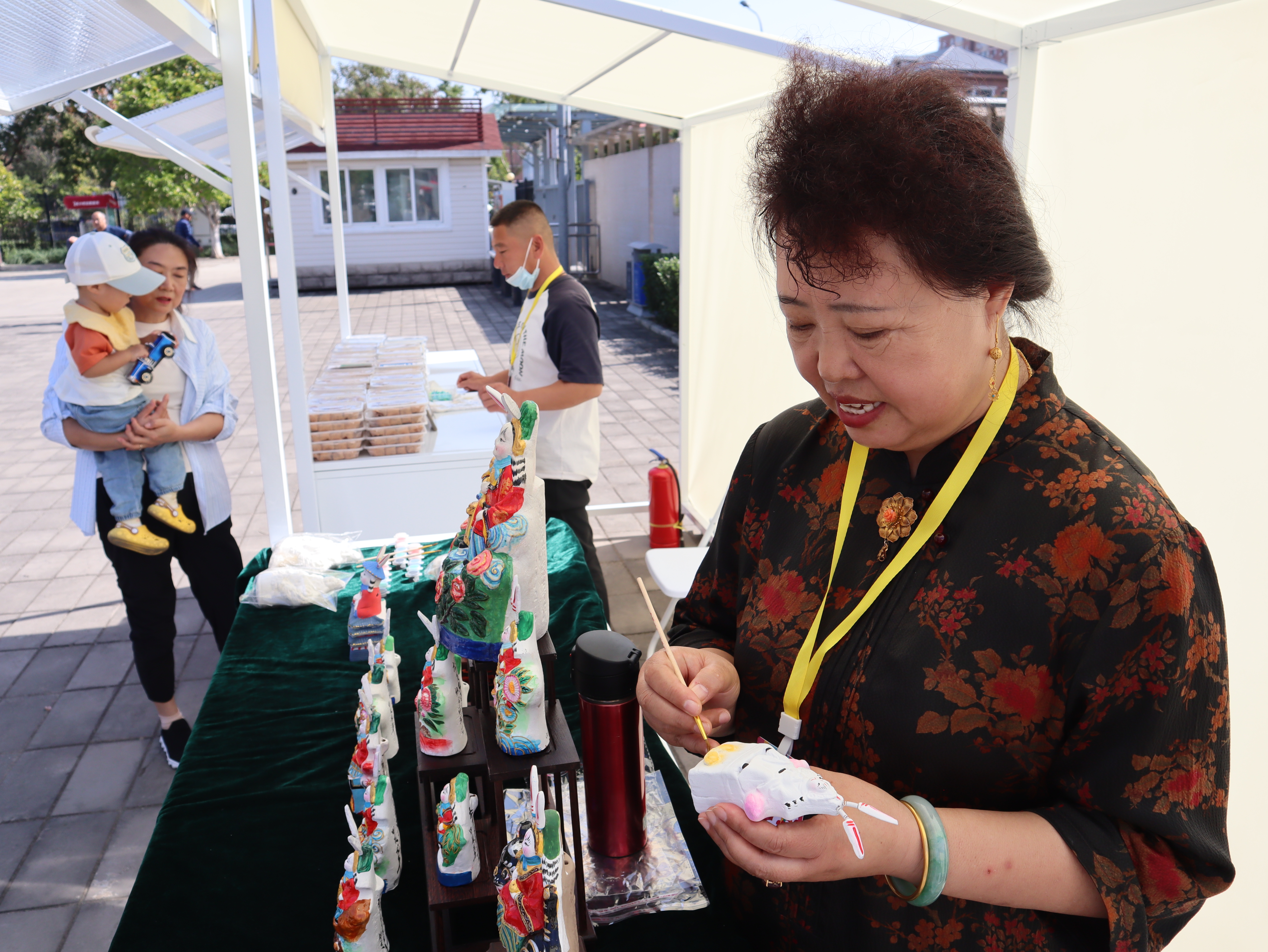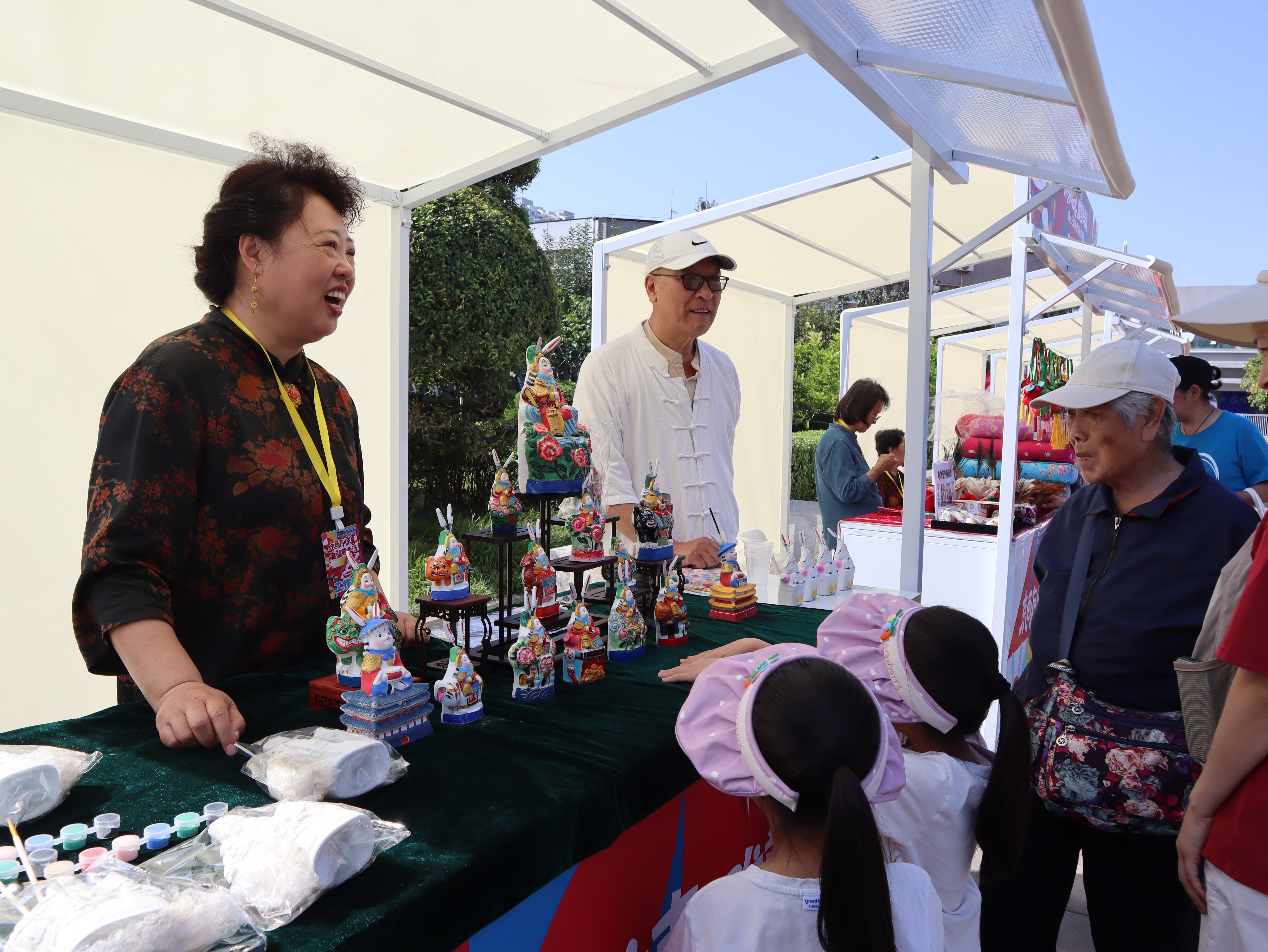 骑着狮子的“事事如意”兔儿爷、端坐菊花台的“安居乐业”兔儿爷、还有专为小朋友体验准备的彩绘材料包……在众多的传统兔儿爷作品当中,两尊以北京中轴线建筑为基座的新型兔儿爷格外醒目:一只兔儿爷身下坐着的是红墙琉璃瓦的故宫建筑,另一只兔儿爷身下则是灰墙灰瓦的永定门城楼,它们手中抱着红色的鼓,代表鼓楼,头上的帽子则化用了天坛祈年殿的造型。“这两幅作品都是我最新创作的,从构思、塑形、彩绘到最终成型花费了近一年的时间,如今它们是2025东城区‘非遗焕新’专项扶持资金支持项目中的一员。今年是北京中轴线申遗成功一周年,我希望用这种方式让古都文化与现代生活融合,弘扬北京的古建筑文化,同时也传承兔儿爷这项老北京非遗技艺。”林爱幸说。