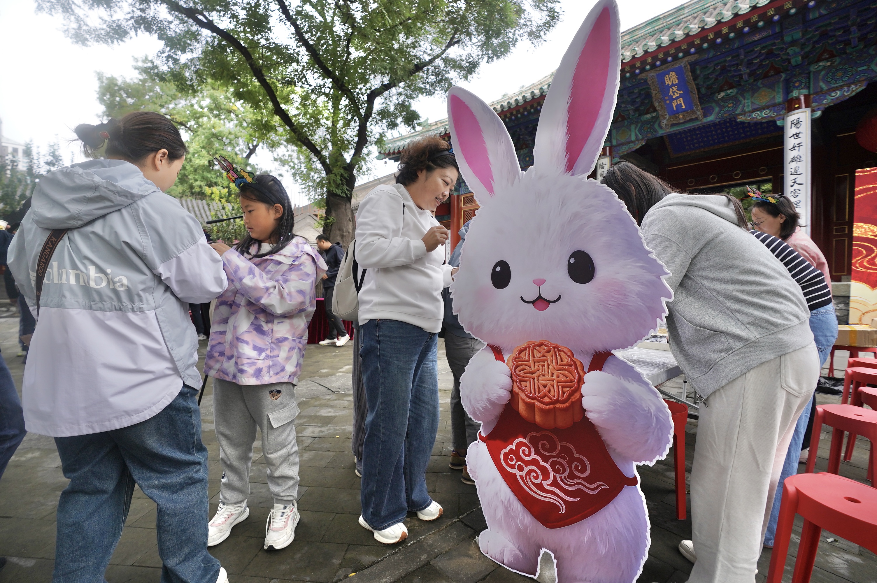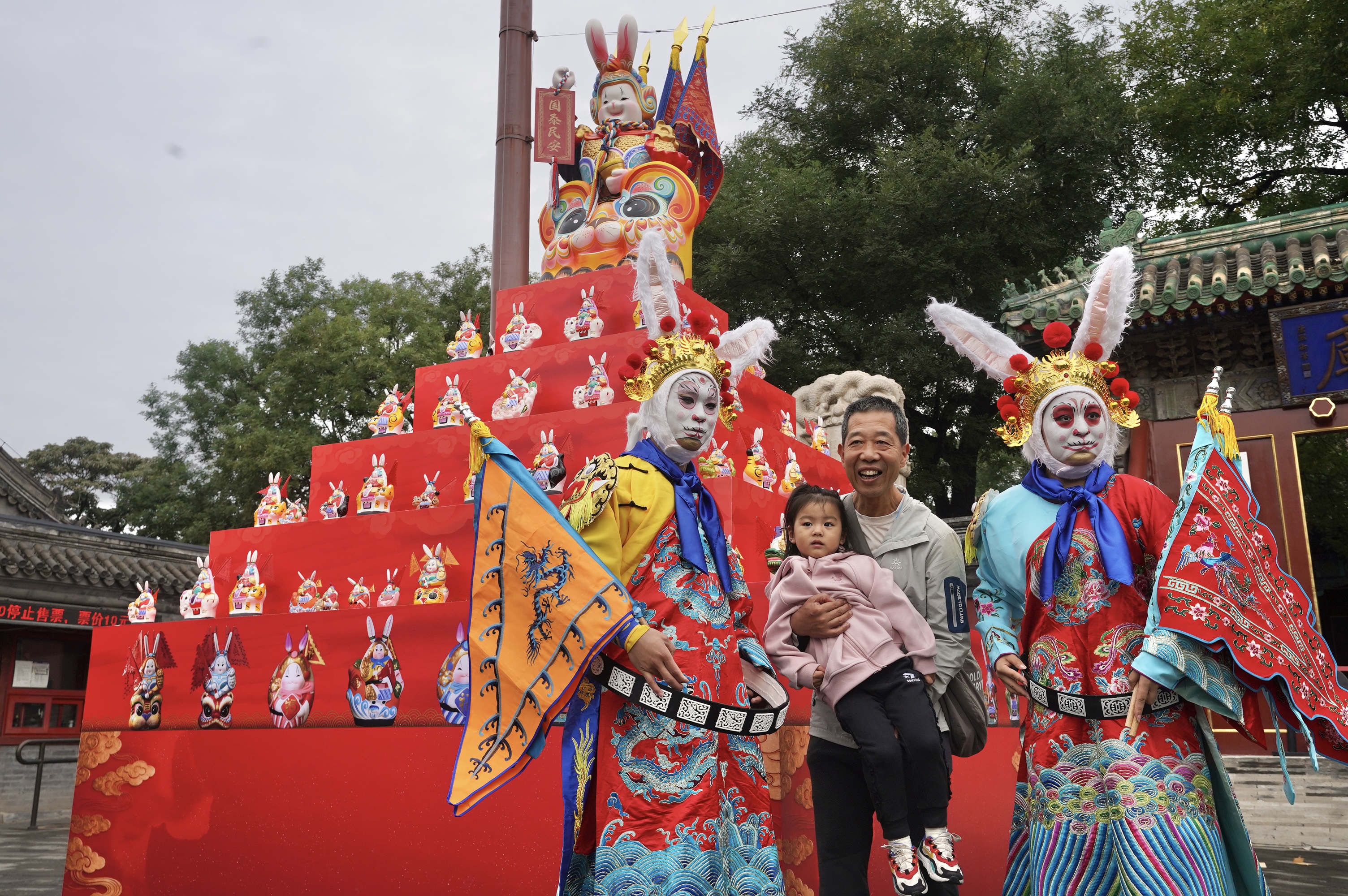 作为老北京的文化符号,兔儿爷承载着深厚的文化传统。今年中秋,3米长、4.2米高的兔儿爷山共六层,每层都有骑着虎、象、麒麟等坐骑,身着金甲、头戴金盔、手拿药杵的各式非遗兔儿爷摆件,最高处摆放一尊1.2米高的巨型兔儿爷,威风八面、气宇轩昂。现场工作人员也装扮成兔儿爷与游客合影,留住中秋的文化记忆。