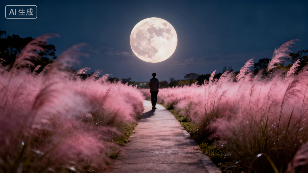 花间步道中段:站在小径中,以粉黛花海为前景,圆月悬于花海尽头,微风拂过花穗摇曳时连拍,捕捉“月下粉雾” 动态美。