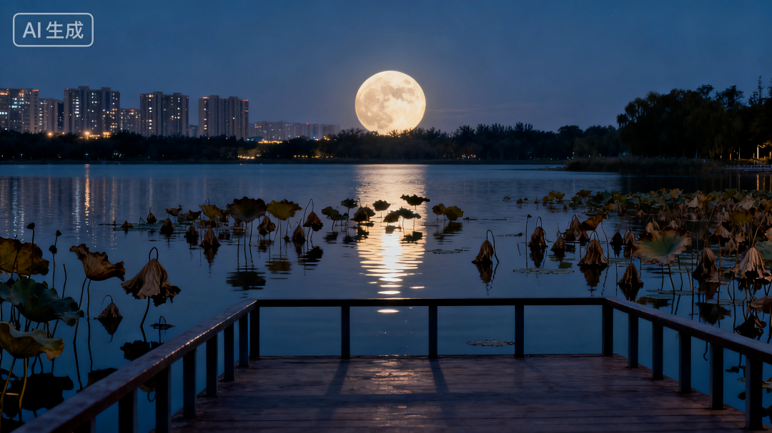 东岸观景台:以无边湖面为底,远处高楼灯火作点缀,圆月从荷叶残枝后升起时按下快门,可获“月涌荷塘” 意境。