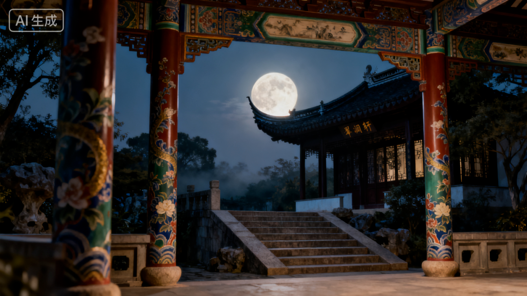 翠润轩前石阶:以苏式彩画廊柱为前景,拍摄月亮穿过檐角的瞬间,古建筑纹理与月色朦胧感相得益彰。