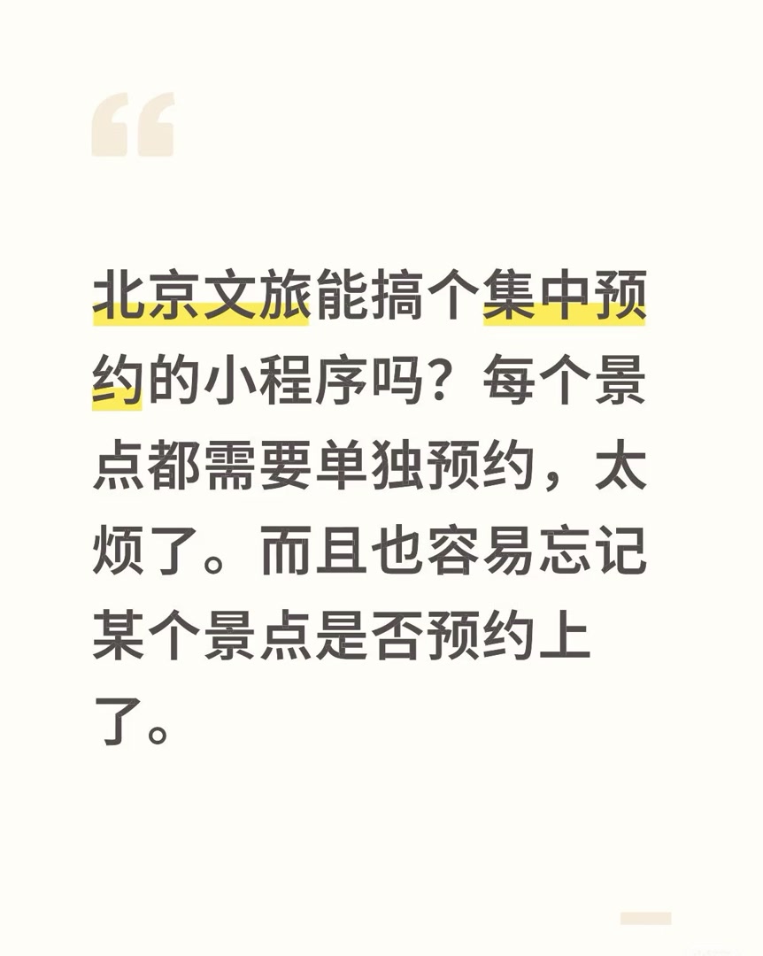 据记者了解,在国庆中秋假期期间,众多游客发现,预约故宫、国家博物馆、天坛等不同景点,需分别登录不同的公众号或小程序,反复填写个人信息,流程复杂且不易统筹管理行程。这一痛点在不同社交平台引发共鸣,不少网友直接“喊话”@文旅北京,呼吁“建立一个全市集中的预约入口,让游玩更省心”。相关诉求持续发酵,成为舆论关注热点。