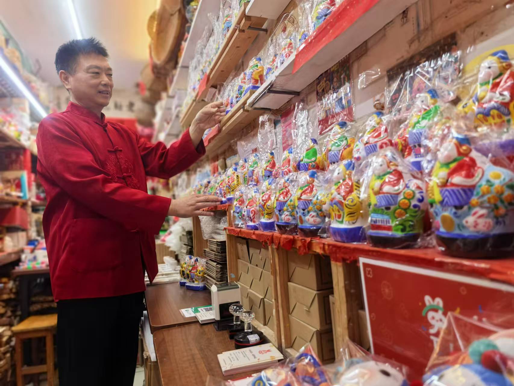一对夫妻带着小辈儿正在店里体验彩塑,也跟传承人张忠强热络地聊起来。“13年前他俩刚相识那会儿,就在我这小店里请的兔儿爷,今天带着孩子故地重游,延续这份感情。”张忠强说,“看着兔儿爷在一代代人手里‘活’起来,我就知道,这中秋的兔儿爷情、老北京的文化根就能这么传下去了。”