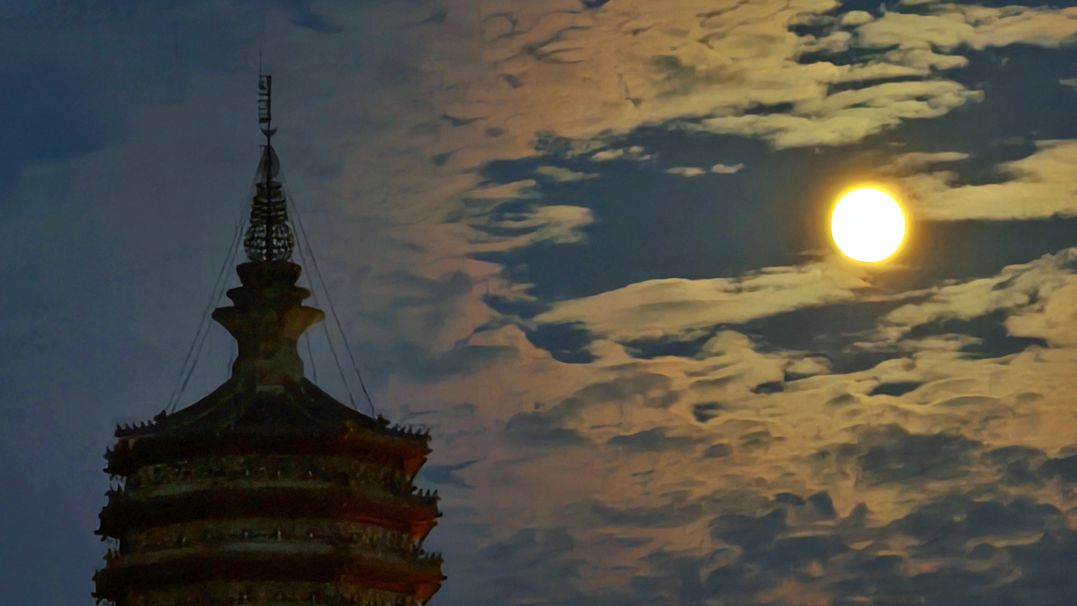今天傍晚,一轮中秋月冲破云层,在通州燃灯塔旁缓缓升起,此景吸引着市民纷纷驻足,拍照留念。