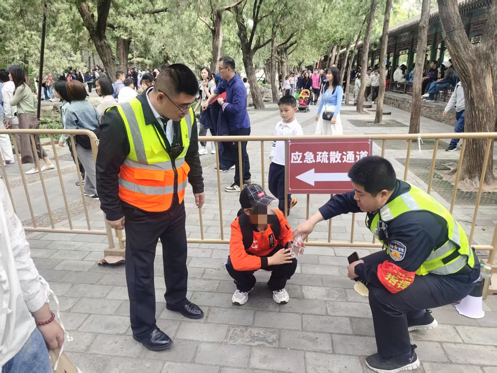 帮助走失游客也是王冠炜和同事们每天要做的工作。“节日这几天,每天都有二三十起老人、孩童走失的求助。”10月4日下午,一名5岁男孩在对鸥舫码头附近与家人走散,蹲在地上大哭。王冠炜发现后,一边安抚孩子情绪,一边上报园内巡逻民警通过监控帮忙找寻,最终在1个小时后找到了孩子的父母。