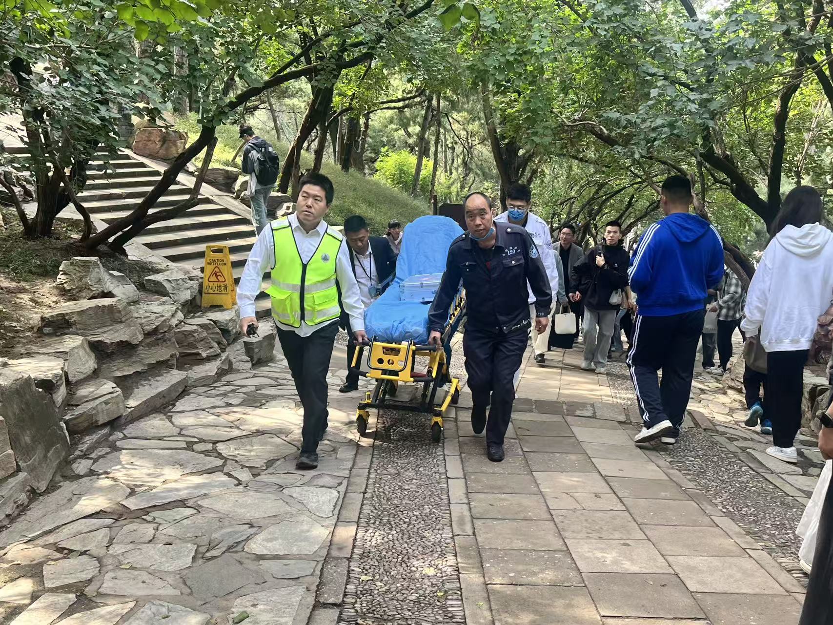 10月6日中午,万寿山景区最高处发生一起游客摔伤事件。接到报警后,王冠炜立即带领队员从山底出发,全力赶往山顶救援。他们与医护人员一同,利用120的推车式急救装备,小心地将受伤游客固定妥当,随后合力从万寿山最高处一路护送游客下山,确保其安全转运至急救车辆上。