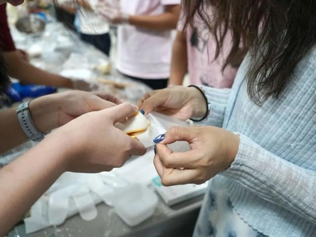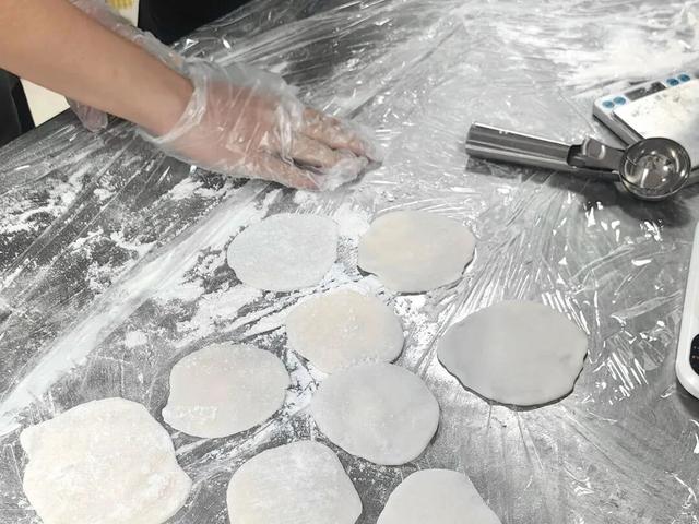 随后在指尖同频中,捏合出团圆形状。新生们将冰皮面团搓圆,用擀面杖压出中间厚、边缘薄的圆皮,再放入馅料、缓慢收口。