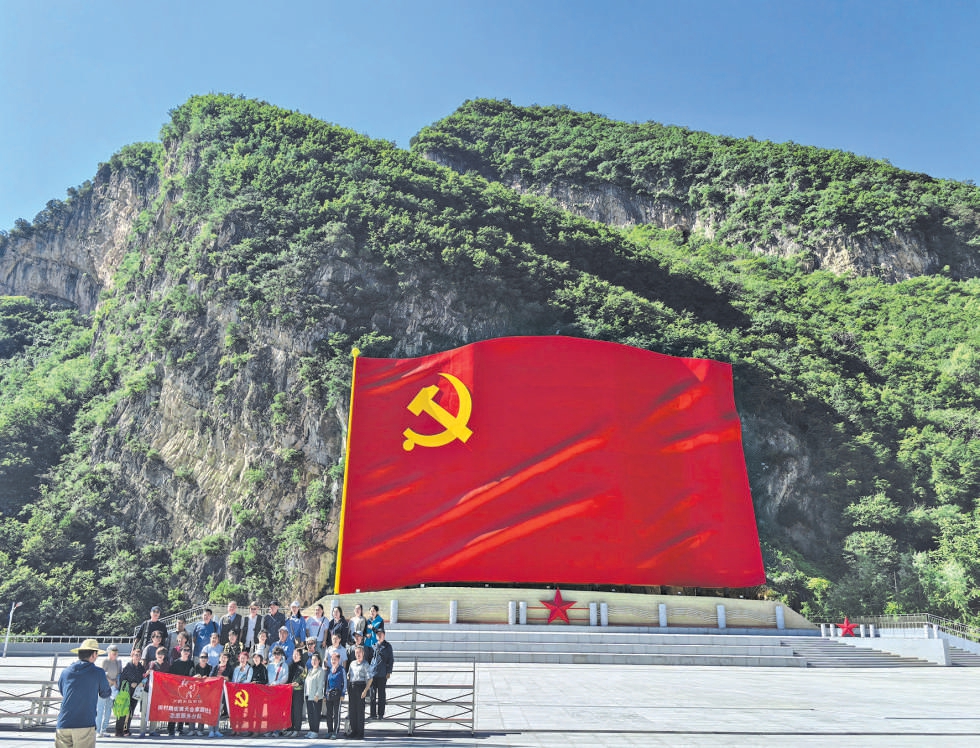 “没有共产党就没有新中国”革命歌曲纪念馆前,960平方米的党旗“挂”在山体之上。有着53年党龄的原村党支部书记李增军,正给参观者讲述歌曲的创作故事:“1943年秋,19岁的曹火星同志住在村里的百年小屋,白天帮着搞减租减息,晚上就着煤油灯写歌。”
