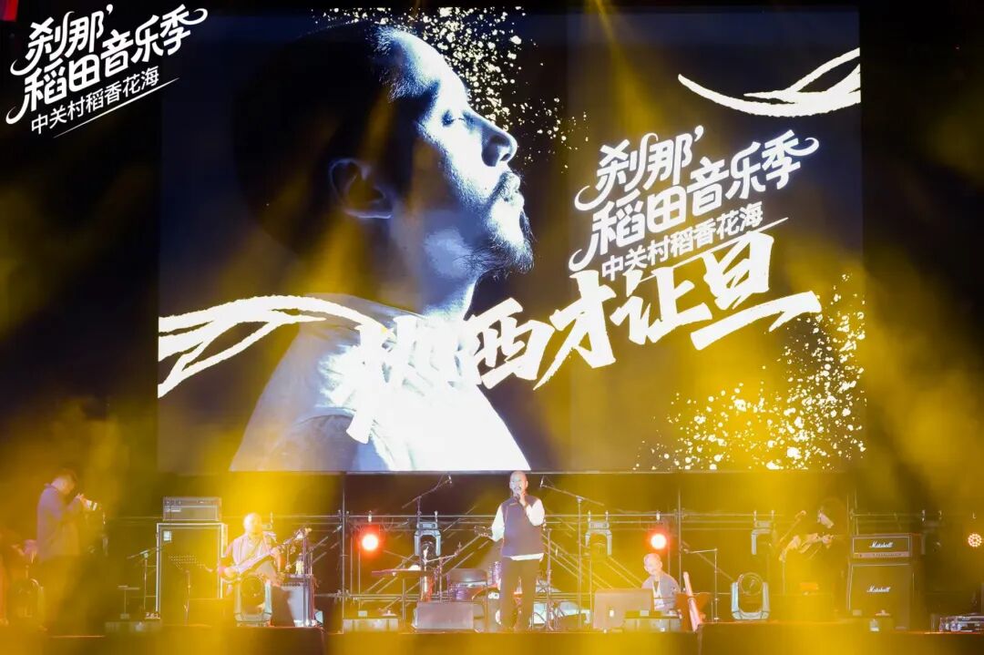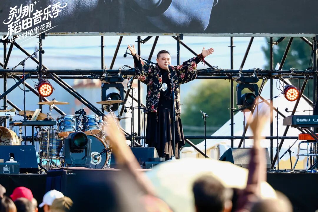 最让人惊艳的是主舞台的设计——三块巨屏嵌在稻浪里,实时捕捉着表演者的神情和风吹稻穗的动态。当唐朝老五刘义军抱着吉他站上舞台,《梦回唐朝》的前奏一响,全场瞬间沸腾。音乐博主@田野记录者说道:“唐朝老五的吉他声穿过稻浪时,我理解了什么是‘摇滚的灵魂’。”灯光扫过千亩稻田,金色的稻穗跟着节奏轻轻摇晃,观众们自发点亮手机手电筒,星星点点的光和舞台灯光交织,活脱脱一片“稻田星海”。