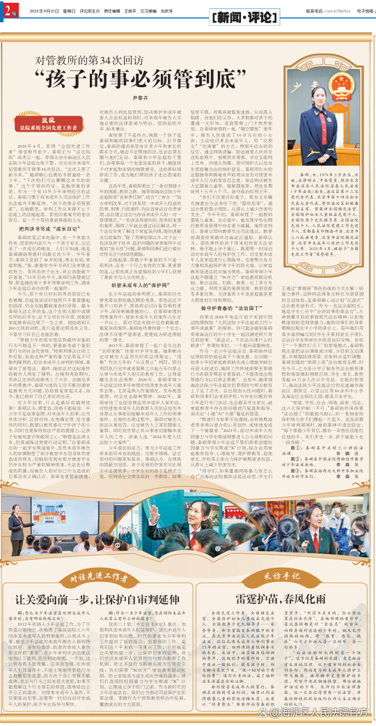 “家庭、学校、社会、网络、政府、司法,这六大保护缺一不可。”秦硕始终保持着“法治园丁”的敏锐与耐心,织一张细密的保护网为孩子们撑起一片蓝天。谈及深耕少年审判领域时,她的眼神中透出坚定,“每个罪错少年背后,都有一双曾经没能拉住他的手。我们多走一步,孩子就能少走一段弯路。”