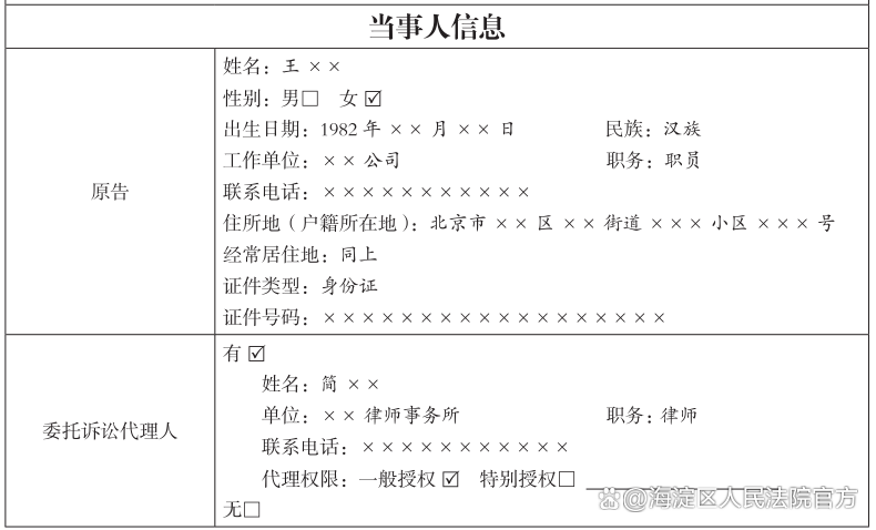 填写当事人信息时,应当按照表格所列内容,准确、完整地进行勾选和填写。需要注意的是,双方当事人的身份信息和地址要确保填写准确。