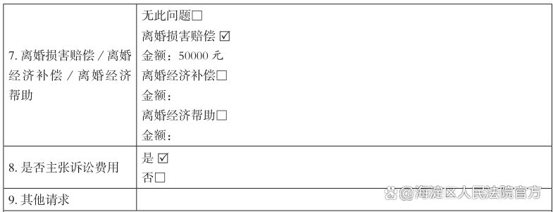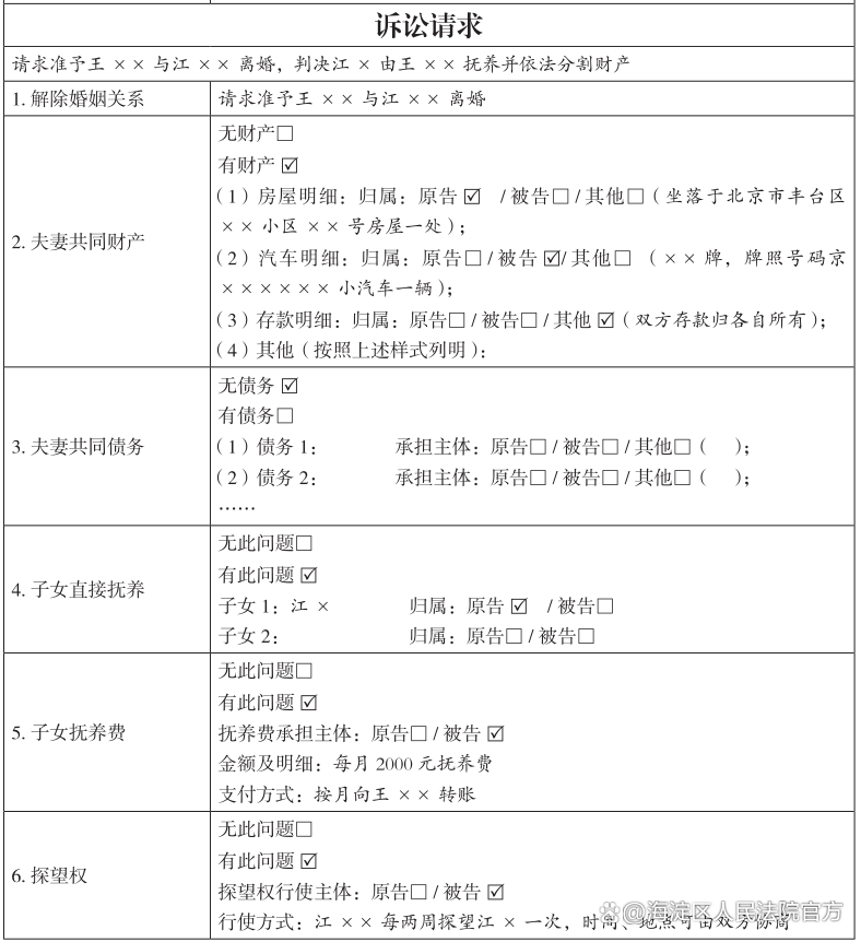 诉讼请求部分对应原告提出的权利主张。离婚诉讼的诉讼请求主要围绕“婚姻关系”“孩子抚养”“财产分割”三大内容展开。“婚姻关系”对应表格中的第1项,即解除婚姻关系的具体请求;“孩子抚养”对应表格中的第4-6项,主要为未成年孩子有谁抚养,抚养费如何支付以及另一方如何行使探望权。“财产分割”对应表格中的第2-3项,主要分割的共同财产与共同债务,其中共同财产包括房屋、车辆、存款以及其他财产,共同债务则包括需要根据实际情况逐一填写。此外,表格中第7-9项是关于离婚经济补偿或赔偿、诉讼费用负担的约定。