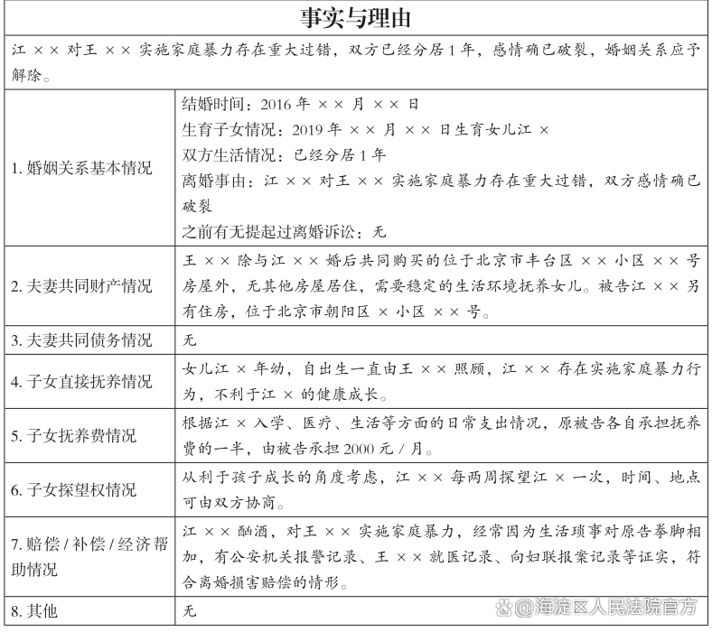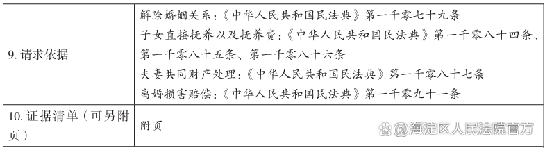 事实与理由部分仍然以“婚姻关系”“孩子抚养”“财产分配”三大核心要素构成,要素表第1-7项进行了列举。第9项则主要列举了相关的法律规定。