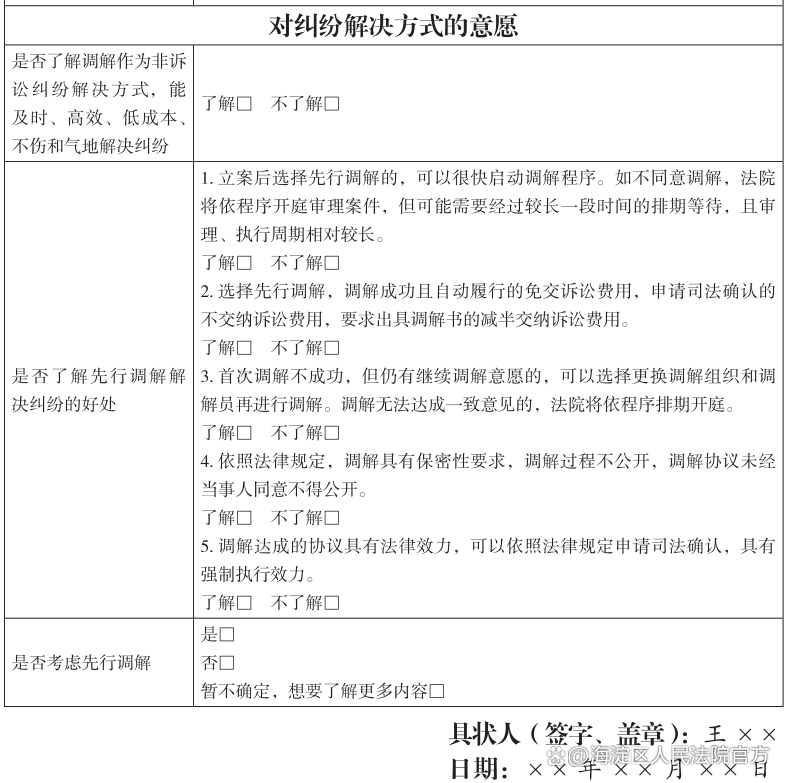本部分与起诉状一致,主要先行调解的程序、周期、费用成本等内容进行介绍,并对答辩人调解意愿进行统计。同样需要提别提示的是:答辩状最后落款部分,答辩人本人务必记得要亲笔手写签名!