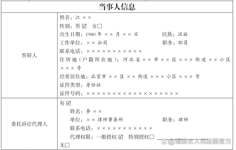 当事人信息只需要填写答辩方的信息,填写要求与起诉状一致。答辩时,答辩人可以根据情况选择是否委托代理人,如确定委托代理人的,则应一并提交相关代理手续。答辩状填写的送达地址及电子送达方式要明确,以便及时收到法院通知。