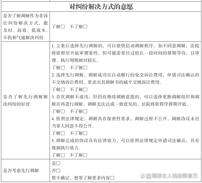对纠纷解决方式的意愿主要对“调解”方式进行了介绍,如先行调解的程序、周期、费用成本等,并对原告的调解意愿进行统计,使原告在立案时充分了解不同纠纷化解方式的特点,帮助原告选择最有利的方式解决纠纷。