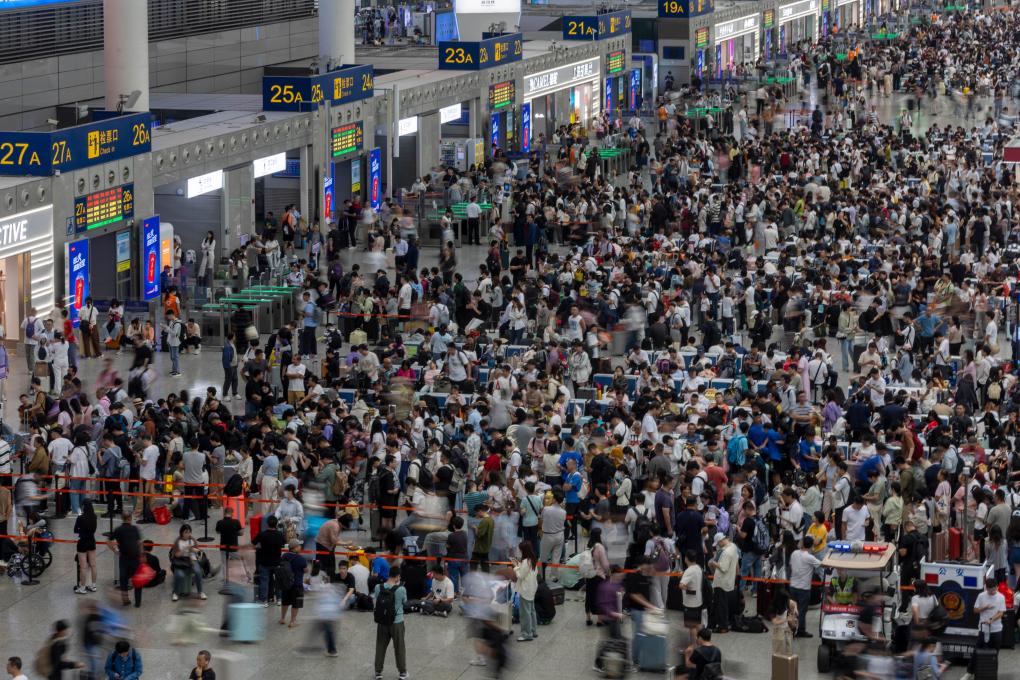 2025年10月1日,旅客在上海虹桥站候车大厅候车。当日是国庆假期第一天,各地迎来出行高峰。新华社记者 王翔 摄
