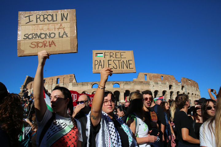 2025年10月4日,在意大利罗马,声援巴勒斯坦的游行队伍向斗兽场行进,要求以色列立即停止对加沙地带的军事行动,释放“全球坚韧船队”人员。新华社记者 李京 摄
